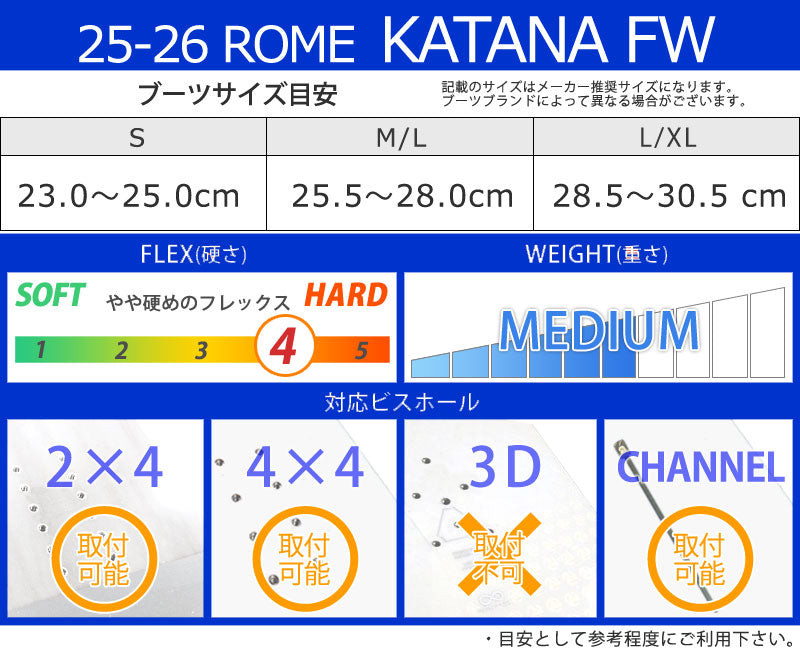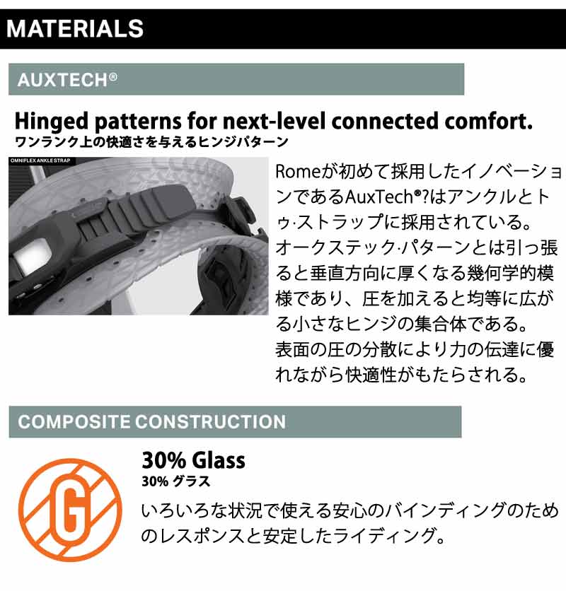 | ベストマッチブーツ | ・ROME/ローム ※ご使用サイズやモデル等で変わる部分もございますのであくまで目安としてお考え下さい。 こちらに記載以外のバインディングにも使用可能です。 |