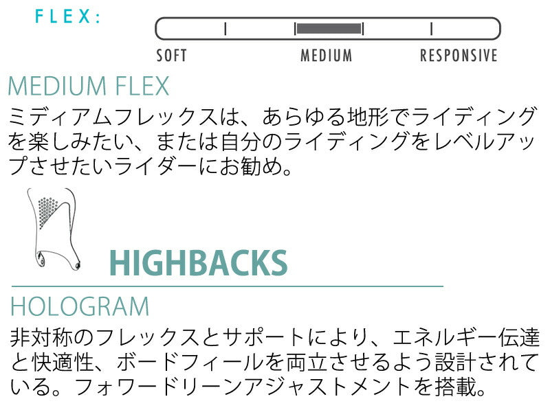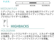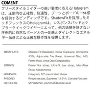 フリースタイルライダーの高い要求に応えるHologramは、圧倒的な正確性、快適性、ブーツとボードの一体感を提供するビンディングです。ShadowFitを採用したミッドフレックスのHologramは、レスポンスパッドとケブラークイックワイヤーによって、他の追随を許さない圧倒的に自然なボードとの一体感とダイレクトなエネルギー伝達による正確な操作性を提供します。 バインディングとブーツの相性やフィッティングに関して等、ご不明な点があればお気軽にお問い合わせください。 ※滑走での振動やストラップの着脱等でビスを使用している部分は緩んできますので、締り具合など滑走前に必ずご確認をお願いします。またご使用のブーツとストラップの調整をお願いいたします。調整が適切でない場合、負荷が集中し破損の原因となります。 |
