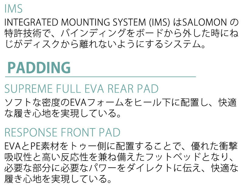| ベストマッチブーツ | ・SALOMON/サロモン ※ご使用サイズやモデル等で変わる部分もございますのであくまで目安としてお考え下さい。 こちらに記載以外のバインディングにも使用可能です。 |