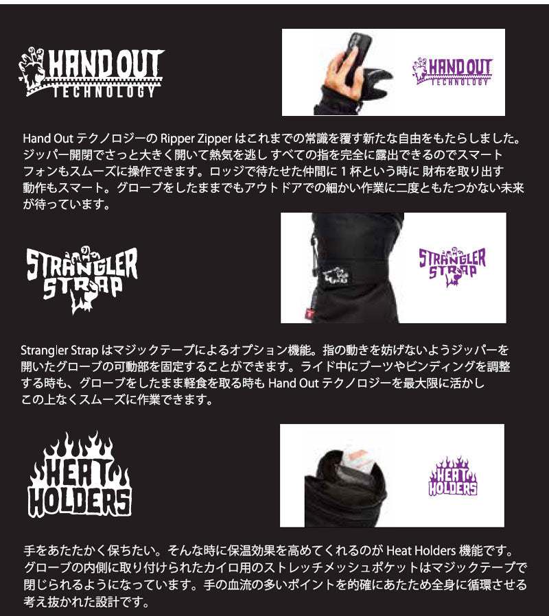 さらに、Hand Out TechnologyのRipperジッパー、ヒートホルダー、パスポケットも備え、機能性に優れた手袋の完成です。