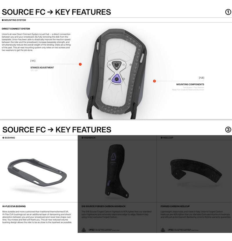 精密さを追求して設計されたUnion Source Proは、Source FCのような極端な感覚を持たずにパフォーマンスを求めるスノーボーダーにバランスの取れた乗り心地を提供します。 やや控えめなハイバックと幅広のアンクルストラップにより、ライダーとスノーボードの密接なつながりを維持しながら、並外れた快適性とコントロール性を提供します。 ユニオンバインディングがスタートした15年ほど前と今を比べると、スノーボード業界には様々な変化がありました。 しかし、1つ変らない事があります。 ボードとライダーを繋げるシステム、そしてその繋がりが最高のライディング・エクスペリエンスのカギを握るということ。 私たちユニオンバインディングはこの“繋がり”をより良い物にする事に全てを捧げ、ライダー達それぞれのライディングタイプや好み、予算までも考え、長年に渡り様々なバインディングを世に送り出してきました。 あなたがユニオンバインディングのシンボルでもある”U”のロゴに出会うことは、間違いない信頼を手にすることになるでしょう。 そう、私たちが保証します。 バインディングとブーツの相性やフィッティングに関して等、ご不明な点があればお気軽にお問い合わせください。 ※滑走での振動やストラップの着脱等でビスを使用している部分は緩んできますので、締り具合など滑走前に必ずご確認をお願いします。またご使用のブーツとストラップの調整をお願いいたします。調整が適切でない場合、負荷が集中し破損の原因となります。 |