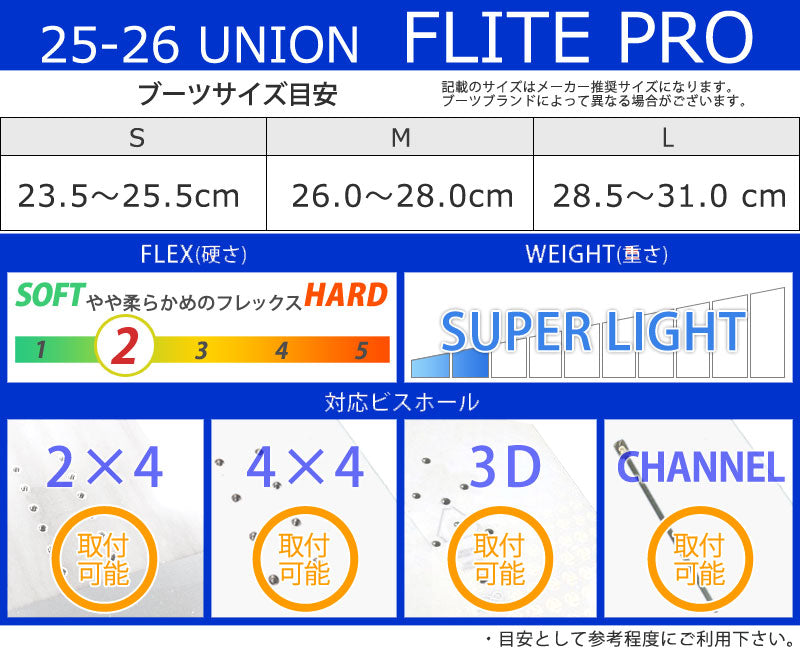 市場で最も軽量なメンズスノーボードビンディングを装着しましょう。 Union Flite Proは、初心者から中級者向けの軽量でソフトフレックスのフリースタイルスノーボードビンディングです。 山全体を滑る練習や、初めてパークで滑るのに最適です。 バインディングとブーツの相性やフィッティングに関して等、ご不明な点があればお気軽にお問い合わせください。 ※滑走での振動やストラップの着脱等でビスを使用している部分は緩んできますので、締り具合など滑走前に必ずご確認をお願いします。またご使用のブーツとストラップの調整をお願いいたします。調整が適切でない場合、負荷が集中し破損の原因となります。 |