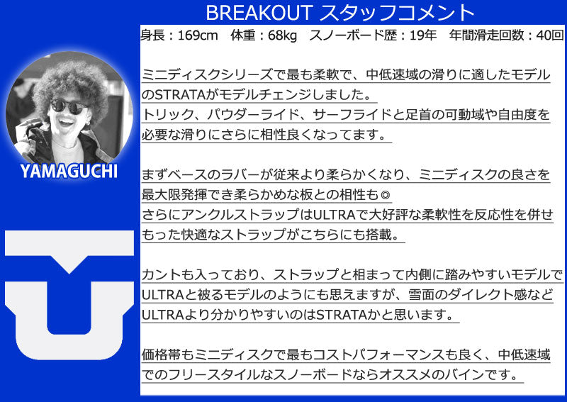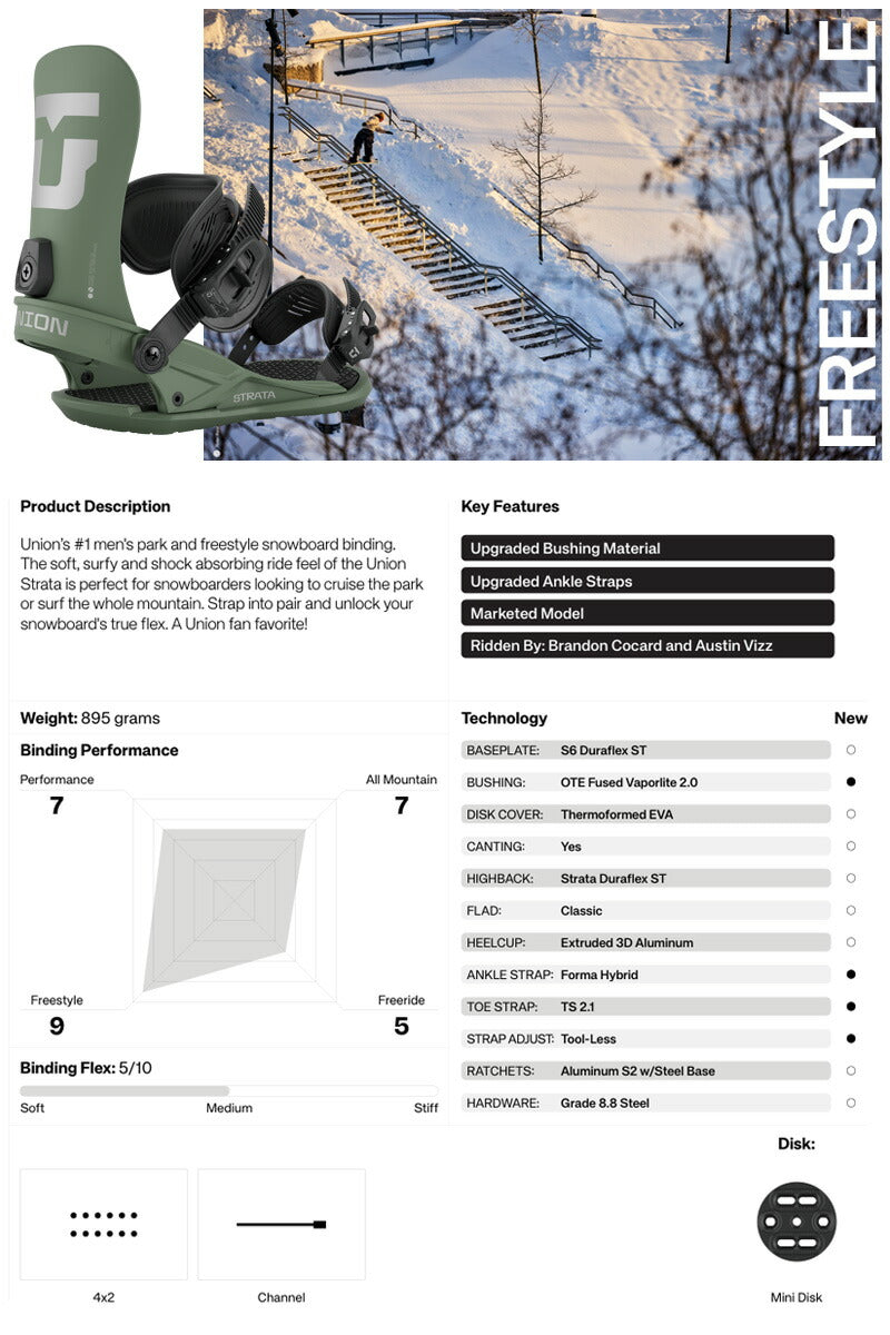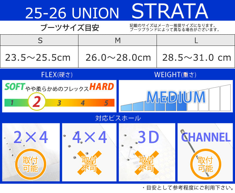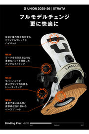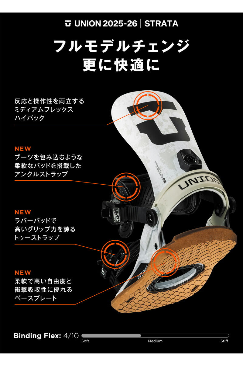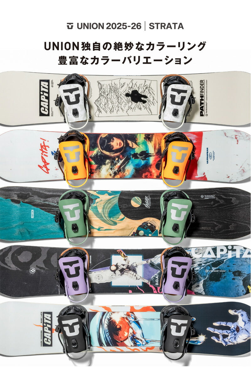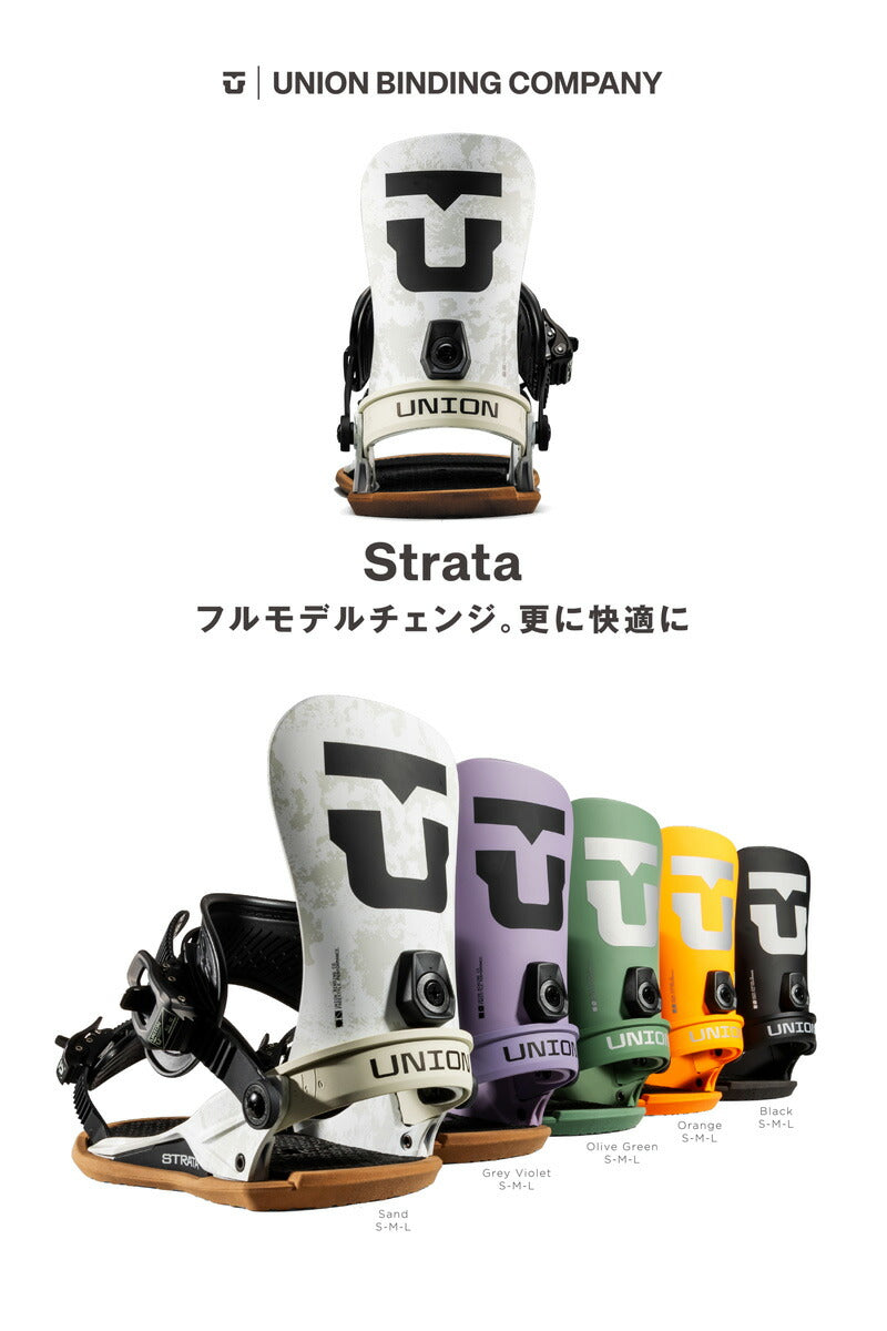 Union の No.1メンズパークおよびフリースタイルスノーボードバインディング。 Union Strata の柔らかく、サーフィンのような、衝撃を吸収する乗り心地は、パークをクルージングしたり、山全体をサーフィンしたりしたいスノーボーダーに最適です。 ペアでストラップを締めて、スノーボードの真のフレックスを解き放ちましょう。 Unionファンのお気に入り! ユニオンバインディングがスタートした15年ほど前と今を比べると、スノーボード業界には様々な変化がありました。 しかし、1つ変らない事があります。 ボードとライダーを繋げるシステム、そしてその繋がりが最高のライディング・エクスペリエンスのカギを握るということ。 私たちユニオンバインディングはこの“繋がり”をより良い物にする事に全てを捧げ、ライダー達それぞれのライディングタイプや好み、予算までも考え、長年に渡り様々なバインディングを世に送り出してきました。 あなたがユニオンバインディングのシンボルでもある”U”のロゴに出会うことは、間違いない信頼を手にすることになるでしょう。 そう、私たちが保証します。 バインディングとブーツの相性やフィッティングに関して等、ご不明な点があればお気軽にお問い合わせください。 ※滑走での振動やストラップの着脱等でビスを使用している部分は緩んできますので、締り具合など滑走前に必ずご確認をお願いします。またご使用のブーツとストラップの調整をお願いいたします。調整が適切でない場合、負荷が集中し破損の原因となります。 |
