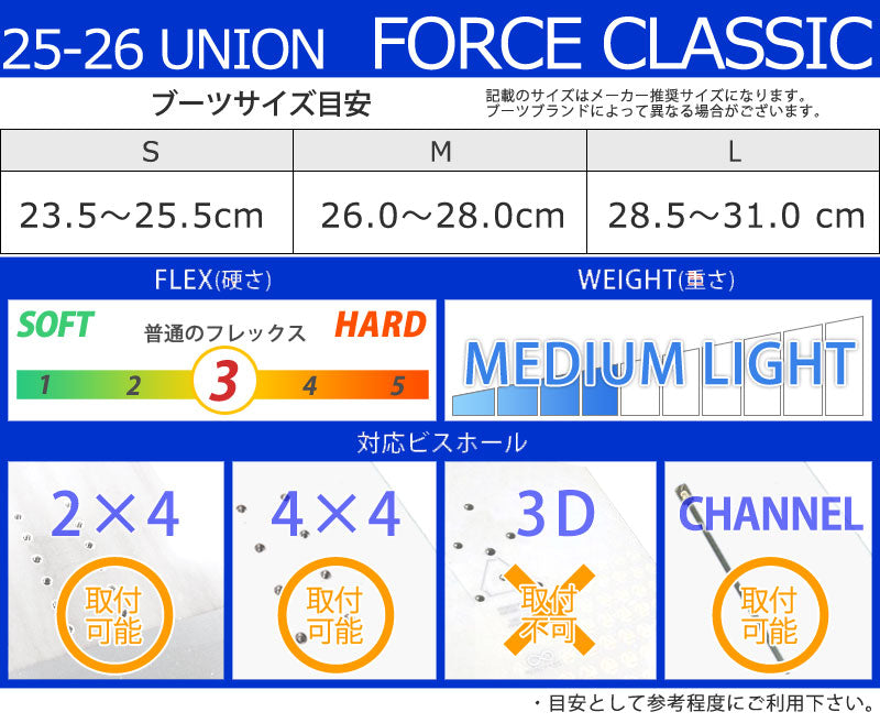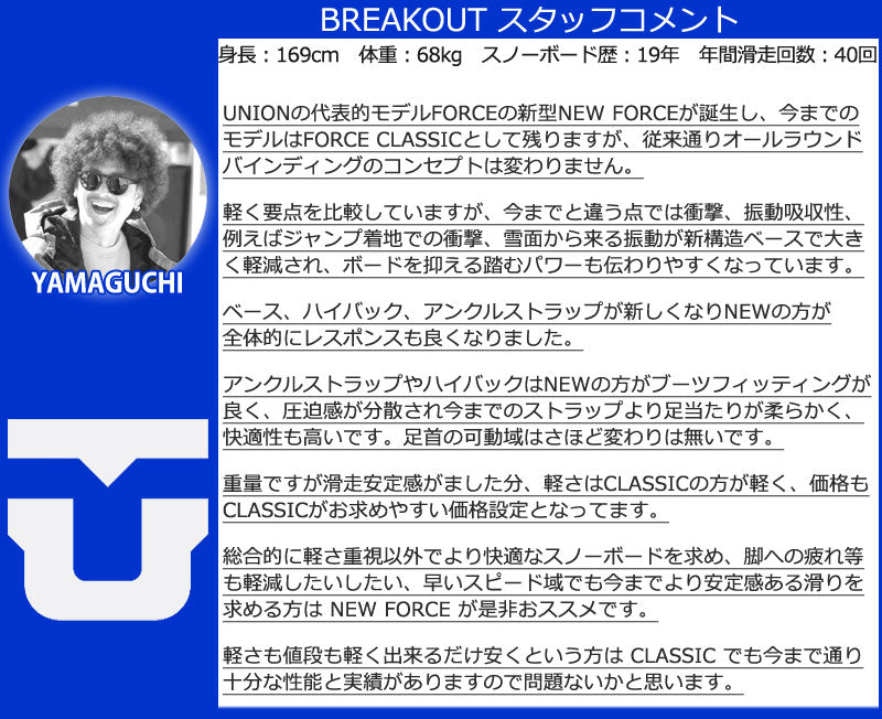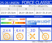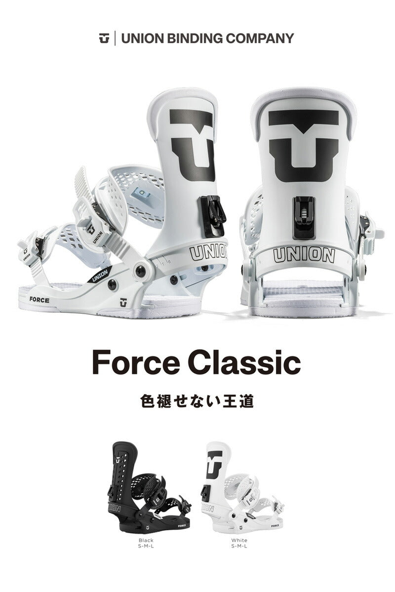 ユニオン史上最も象徴的でベストセラーのビンディングモデル。 ユニオンフォースクラシックは、あらゆる用途に対応するよう設計された、頑丈なオールマウンテンスノーボードビンディングです。 シーズンごとに変更が最小限に抑えられたフォースクラシックは、今後も長く愛用されるでしょう。 ユニオンバインディングがスタートした15年ほど前と今を比べると、スノーボード業界には様々な変化がありました。 しかし、1つ変らない事があります。 ボードとライダーを繋げるシステム、そしてその繋がりが最高のライディング・エクスペリエンスのカギを握るということ。 私たちユニオンバインディングはこの“繋がり”をより良い物にする事に全てを捧げ、ライダー達それぞれのライディングタイプや好み、予算までも考え、長年に渡り様々なバインディングを世に送り出してきました。 あなたがユニオンバインディングのシンボルでもある”U”のロゴに出会うことは、間違いない信頼を手にすることになるでしょう。 そう、私たちが保証します。 バインディングとブーツの相性やフィッティングに関して等、ご不明な点があればお気軽にお問い合わせください。 ※滑走での振動やストラップの着脱等でビスを使用している部分は緩んできますので、締り具合など滑走前に必ずご確認をお願いします。またご使用のブーツとストラップの調整をお願いいたします。調整が適切でない場合、負荷が集中し破損の原因となります。 |
