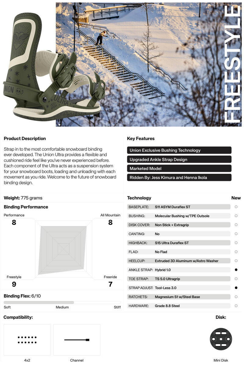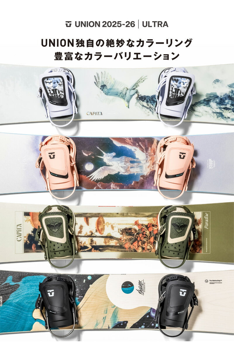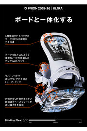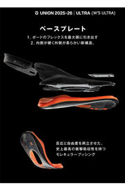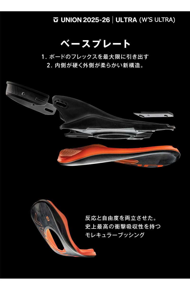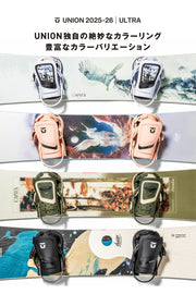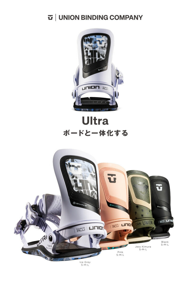 これまでに開発された中で最も快適なスノーボードバインディングを装着してください。 Union Ultraは、これまでに経験したことのないような柔軟でクッション性のある乗り心地を提供します。 Ultraの各コンポーネントは、スノーボードブーツのサスペンションシステムとして機能し、乗車中の動きに合わせて荷重をかけたり下ろしたりします。 スノーボードバインディング デザインの未来へようこそ。 ユニオンバインディングがスタートした15年ほど前と今を比べると、スノーボード業界には様々な変化がありました。 しかし、1つ変らない事があります。 ボードとライダーを繋げるシステム、そしてその繋がりが最高のライディング・エクスペリエンスのカギを握るということ。 私たちユニオンバインディングはこの“繋がり”をより良い物にする事に全てを捧げ、ライダー達それぞれのライディングタイプや好み、予算までも考え、長年に渡り様々なバインディングを世に送り出してきました。 あなたがユニオンバインディングのシンボルでもある”U”のロゴに出会うことは、間違いない信頼を手にすることになるでしょう。 そう、私たちが保証します。 バインディングとブーツの相性やフィッティングに関して等、ご不明な点があればお気軽にお問い合わせください。 ※滑走での振動やストラップの着脱等でビスを使用している部分は緩んできますので、締り具合など滑走前に必ずご確認をお願いします。またご使用のブーツとストラップの調整をお願いいたします。調整が適切でない場合、負荷が集中し破損の原因となります。 |