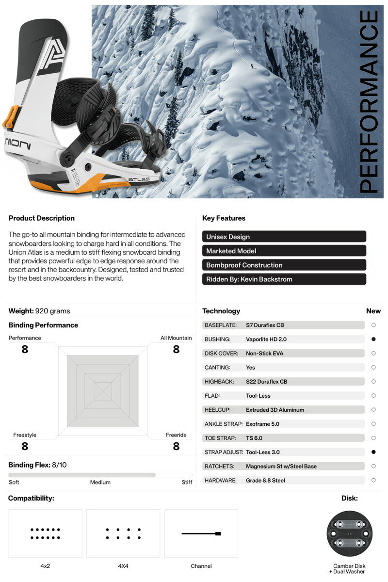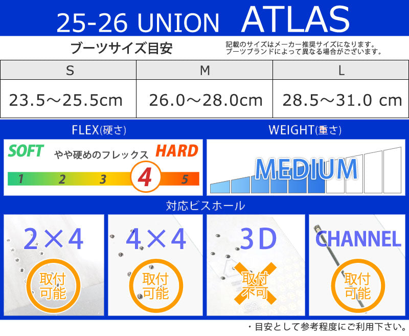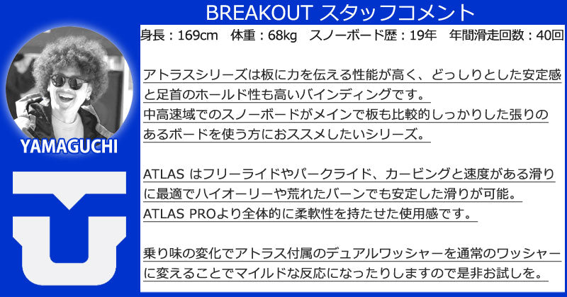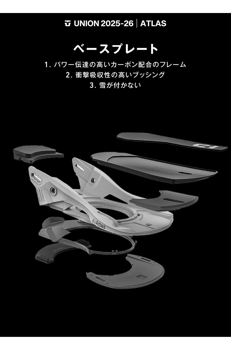 あらゆる状況で激しく攻めようとする中級から上級のスノーボーダーに最適なオールマウンテンビンディング。 Union Atlas は、中程度から硬めのフレックスのスノーボードビンディングで、リゾートやバックカントリーでエッジからエッジまでの強力なレスポンスを提供します。 世界最高のスノーボーダーによって設計、テストされ、信頼されています。 ユニオンバインディングがスタートした15年ほど前と今を比べると、スノーボード業界には様々な変化がありました。 しかし、1つ変らない事があります。 ボードとライダーを繋げるシステム、そしてその繋がりが最高のライディング・エクスペリエンスのカギを握るということ。 私たちユニオンバインディングはこの“繋がり”をより良い物にする事に全てを捧げ、ライダー達それぞれのライディングタイプや好み、予算までも考え、長年に渡り様々なバインディングを世に送り出してきました。 あなたがユニオンバインディングのシンボルでもある”U”のロゴに出会うことは、間違いない信頼を手にすることになるでしょう。 そう、私たちが保証します。 バインディングとブーツの相性やフィッティングに関して等、ご不明な点があればお気軽にお問い合わせください。 ※滑走での振動やストラップの着脱等でビスを使用している部分は緩んできますので、締り具合など滑走前に必ずご確認をお願いします。またご使用のブーツとストラップの調整をお願いいたします。調整が適切でない場合、負荷が集中し破損の原因となります。 |