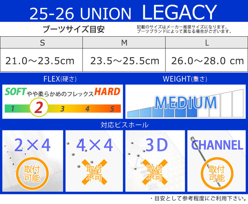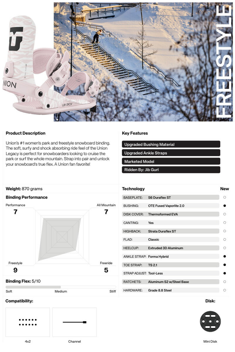 ユニオンのナンバーワン女性用パーク&フリースタイルスノーボード ビンディング。 ユニオンレガシーのソフトでサーフィンのような衝撃吸収性のある乗り心地は、パークをクルージングしたり、山全体をサーフィンしたりしたいスノーボーダーに最適です。 ペアでストラップを締めて、スノーボードの真のフレックスを解き放ちましょう。 ユニオンファンのお気に入り! バインディングとブーツの相性やフィッティングに関して等、ご不明な点があればお気軽にお問い合わせください。 ※滑走での振動やストラップの着脱等でビスを使用している部分は緩んできますので、締り具合など滑走前に必ずご確認をお願いします。またご使用のブーツとストラップの調整をお願いいたします。調整が適切でない場合、負荷が集中し破損の原因となります。 |