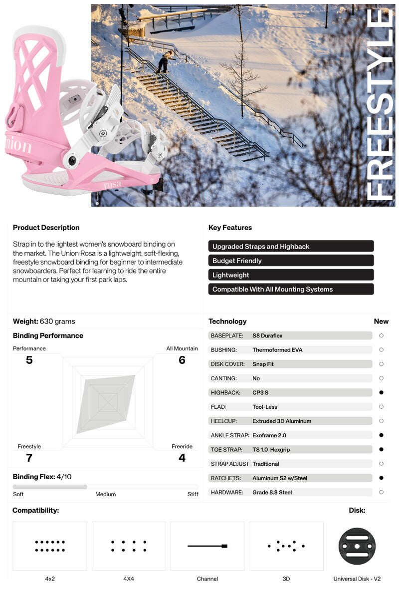 市場で最も軽量な女性用スノーボード ビンディングを装着しましょう。 Union Rosaは、初心者から中級者向けの軽量でソフトなフレックスのフリースタイルスノーボード ビンディングです。 山全体を滑る練習や、初めてパークで滑るのに最適です。 バインディングとブーツの相性やフィッティングに関して等、ご不明な点があればお気軽にお問い合わせください。 ※滑走での振動やストラップの着脱等でビスを使用している部分は緩んできますので、締り具合など滑走前に必ずご確認をお願いします。またご使用のブーツとストラップの調整をお願いいたします。調整が適切でない場合、負荷が集中し破損の原因となります。 |