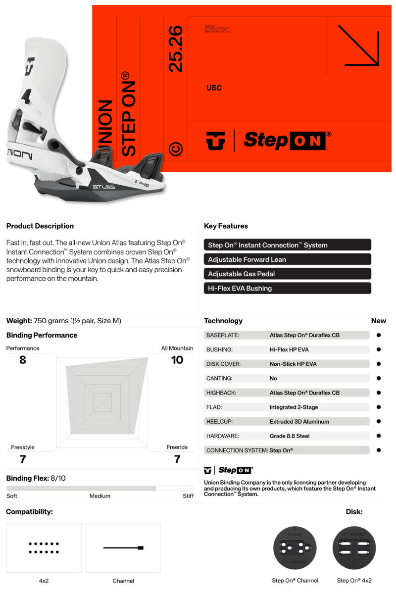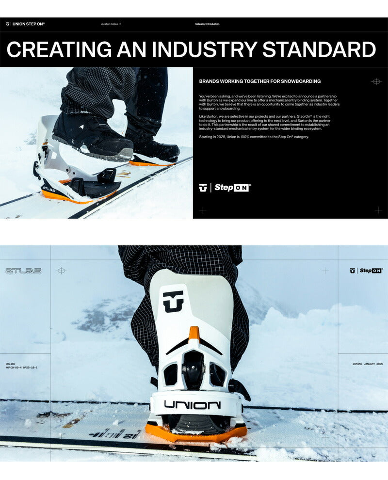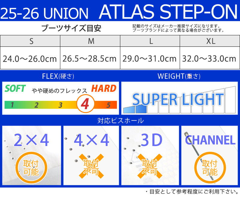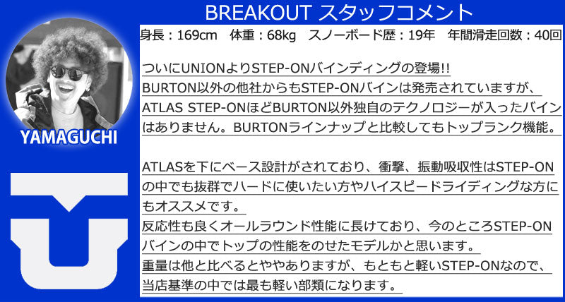 素早く着脱できます。 Step On Instant Connection システムを搭載した最新の Union Atlas は、実績のある Step On テクノロジーと革新的な Union デザインを組み合わせています。 Atlas Step On スノーボードバインディングは、山で素早く簡単に正確なパフォーマンスを実現するための鍵です。 ※こちらはSTEP-ONブーツ専用のバインディングとなります。BURTON,NITRO,DCのSTEP-ONブーツに対応しています。 ※滑走での振動やストラップの着脱等でビスを使用している部分は緩んできますので、締り具合など滑走前に必ずご確認をお願いします。 またご使用のブーツとストラップの調整をお願いいたします。 調整が適切でない場合、負荷が集中し破損の原因となります。 バインディングとブーツの相性やフィッティングに関して等、ご不明な点があればお気軽にお問い合わせください。 ※滑走での振動やストラップの着脱等でビスを使用している部分は緩んできますので、締り具合など滑走前に必ずご確認をお願いします。またご使用のブーツとストラップの調整をお願いいたします。調整が適切でない場合、負荷が集中し破損の原因となります。 |