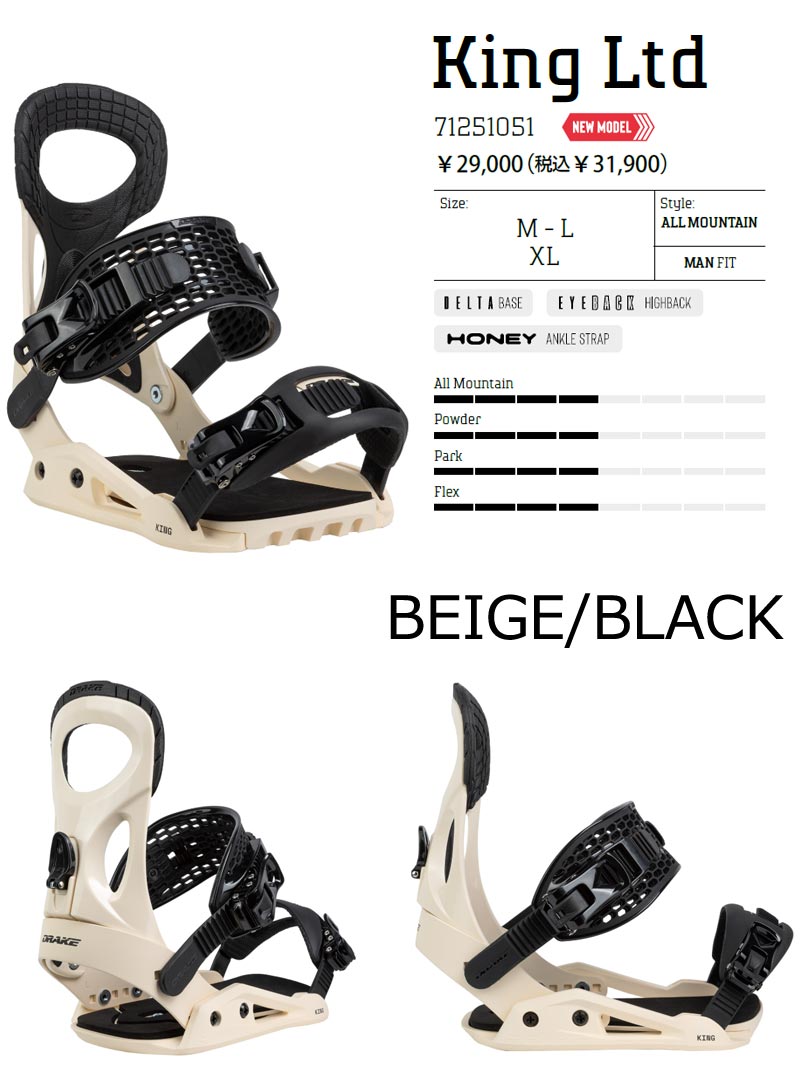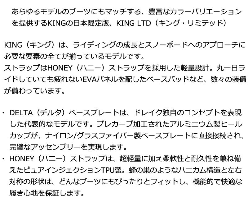 LTD(キング・リミテッド) ・ DELTA(デルタ)ベースプレートは、ドレイク独自のコンセプトを表現した代表的なモデルです。プレカーブ加工されたアルミニウム製ヒールカップが、ナイロン/グラスファイバー製ベースプレートに直接接続され、完璧なアッセンブリーを実現します。 ・ HONEY(ハニー)ストラップは、超軽量に加え柔軟性と耐久性を兼ね備えたピュアインジェクションTPU製。蜂の巣のようなハニカム構造と左右対称の形状は、どんなブーツにもぴったりとフィットし、機能的で快適な履き心地を保証します。 バインディングとブーツの相性やフィッティングに関して等、ご不明な点があればお気軽にお問い合わせください。 ※滑走での振動やストラップの着脱等でビスを使用している部分は緩んできますので、締り具合など滑走前に必ずご確認をお願いします。またご使用のブーツとストラップの調整をお願いいたします。調整が適切でない場合、負荷が集中し破損の原因となります。 |