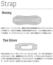 ・ DELTA(デルタ)ベースプレートは、ドレイク独自のコンセプトを表現した代表的なモデルです。プレカーブ加工されたアルミニウム製ヒールカップが、ナイロン/グラスファイバー製ベースプレートに直接接続され、完璧なアッセンブリーを実現します。 ・ HONEY(ハニー)ストラップは、超軽量に加え柔軟性と耐久性を兼ね備えたピュアインジェクションTPU製。蜂の巣のようなハニカム構造と左右対称の形状は、どんなブーツにもぴったりとフィットし、機能的で快適な履き心地を保証します。 バインディングとブーツの相性やフィッティングに関して等、ご不明な点があればお気軽にお問い合わせください。 ※滑走での振動やストラップの着脱等でビスを使用している部分は緩んできますので、締り具合など滑走前に必ずご確認をお願いします。またご使用のブーツとストラップの調整をお願いいたします。調整が適切でない場合、負荷が集中し破損の原因となります。 |