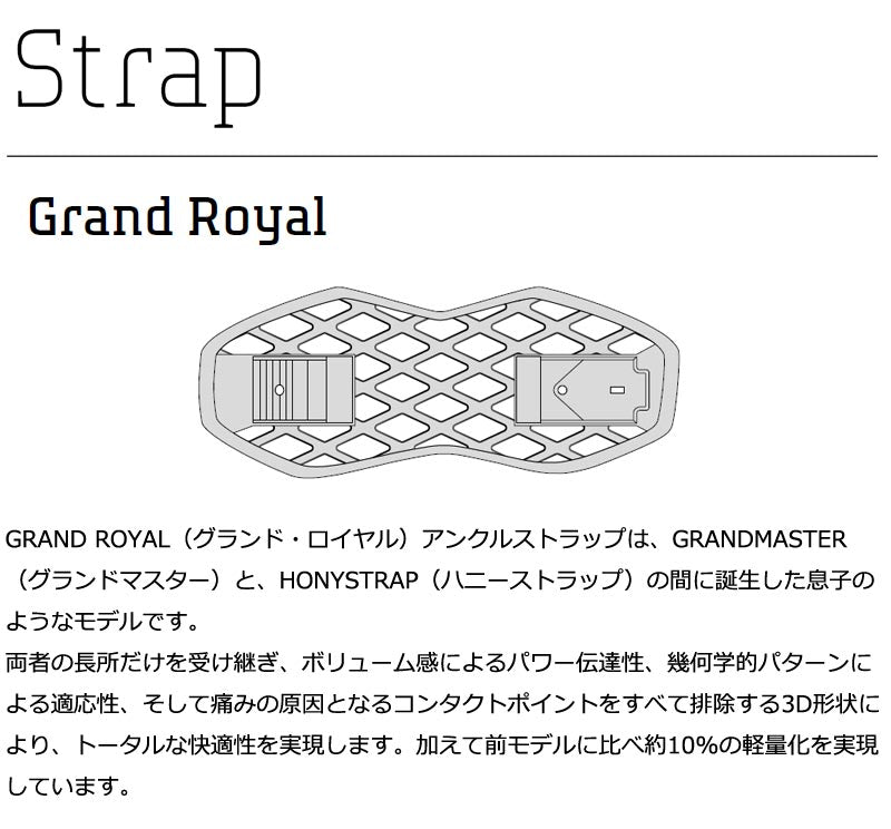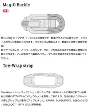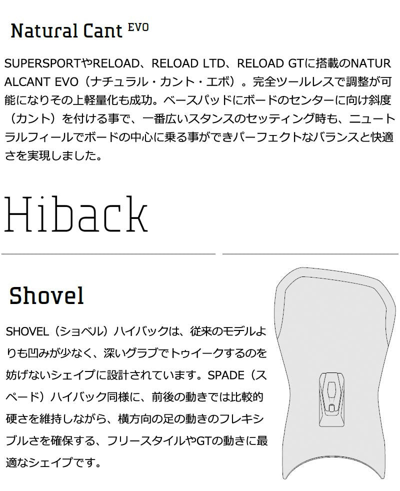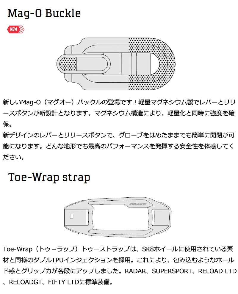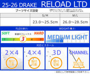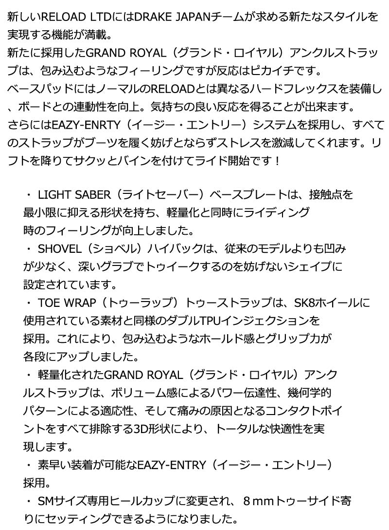 新しいRELOAD LTDにはDRAKE JAPANチームが求める新たなスタイルを実現する機能が満載。 新た に採用したGRAND ROYAL(グランド・ロイヤル)アン クルストラップは、包み込むようなフィーリングですが反 応はピカイチです。 ベースパッドにはノーマルのRELOADとは異なるハードフレックスを装備し、ボードとの連動性を向上。気持ちの良い反応を得ることが出来ます。 さらにはEAZY-ENRTY(イージー・エントリー)システム を採用し、すべてのストラップがブーツを履く妨げとなら ずストレスを激減してくれます。リフトを降りてサクッとバ インを付けてライド開始です! ・ LIGHT SABER(ライトセーバー)ベースプレートは、接触点を最小限に抑える形状を持ち、軽量化と同時にライディング時のフィーリングが向上しました。 ・ SHOVEL(ショベル)ハイバックは、従来のモデルよりも凹みが少なく、深いグラブでトゥイークするのを妨げないシェイプに設定されています。 ・ TOE WRAP(トゥーラップ)トゥーストラップは、SK8ホイールに使用されている素材と同様のダブルTPUインジェクションを採用。これにより、包み込むようなホールド感とグリップ力が各段にアップしました。 ・ 軽量化されたGRAND ROYAL(グランド・ロイヤル)アンクルストラップは、ボリューム感によるパワー伝達性、幾何学的パターンによる適応性、そして痛みの原因となるコンタクトポイントをすべて排除する3D形状により、トータルな快適性を実現します。 ・ 素早い装着が可能なEAZY-ENTRY(イージー・エントリー)採用。 ・ SMサイズ専用ヒールカップに変更され、8mmトゥーサイド寄りにセッティングできるようになりました。 バインディングとブーツの相性やフィッティングに関して等、ご不明な点があればお気軽にお問い合わせください。 ※滑走での振動やストラップの着脱等でビスを使用している部分は緩んできますので、締り具合など滑走前に必ずご確認をお願いします。またご使用のブーツとストラップの調整をお願いいたします。調整が適切でない場合、負荷が集中し破損の原因となります。 |