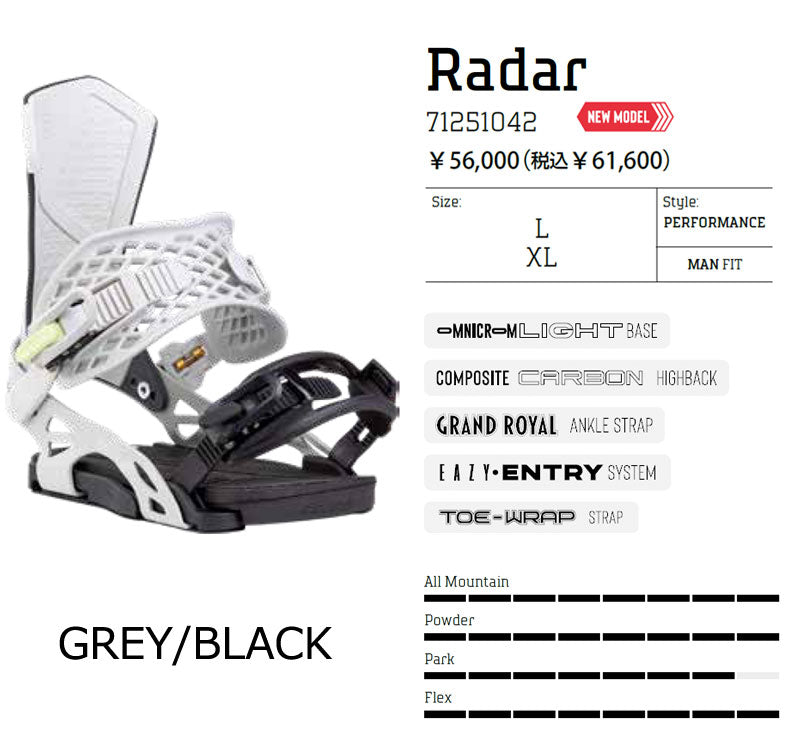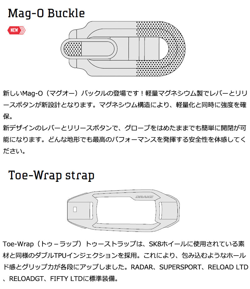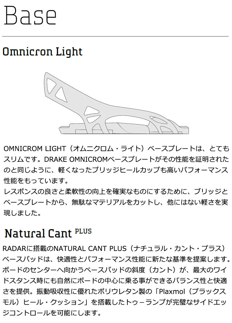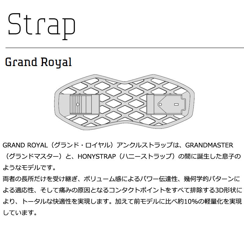 ・ OMNICROM LIGHT(オムニクロム・ライト)ベースプレートは、ブリッジとベースプレートからムダな部分をそぎ落とし、レスポンスの良さと柔軟性を確実にする軽量化を実現しました。 ・ BIOMAP(バイオマップ)左右非対称ハイバックは、ボードへのエネルギー伝達を最適化し、スタンスをサポートします。 ・ GRAND ROYAL(グランド・ロイヤル)アンクルストラップ は、3D形状と幾何学的パターンにより、最大限のパワー伝達、適応性、快適性を提供します。 ・ EAZY-ENTRY(イージー・エントリー)システムはアンクルストラップ・コネクターをスプリングでロックすることによりブーツへのアクセス部を広く保ち、着脱を容易にします。 ・ TOE-WRAP(トゥ−ラップ)トゥーストラップは、SK8ホイールと同素材のダブルTPUインジェクションを採用。包み込むようなホールド感とグリップ力を提供します。 ・ 新設計バックルの締め上げ、リリースがとても楽なMAG-O(マグオー)バックル採用 バインディングとブーツの相性やフィッティングに関して等、ご不明な点があればお気軽にお問い合わせください。 ※滑走での振動やストラップの着脱等でビスを使用している部分は緩んできますので、締り具合など滑走前に必ずご確認をお願いします。またご使用のブーツとストラップの調整をお願いいたします。調整が適切でない場合、負荷が集中し破損の原因となります。 |