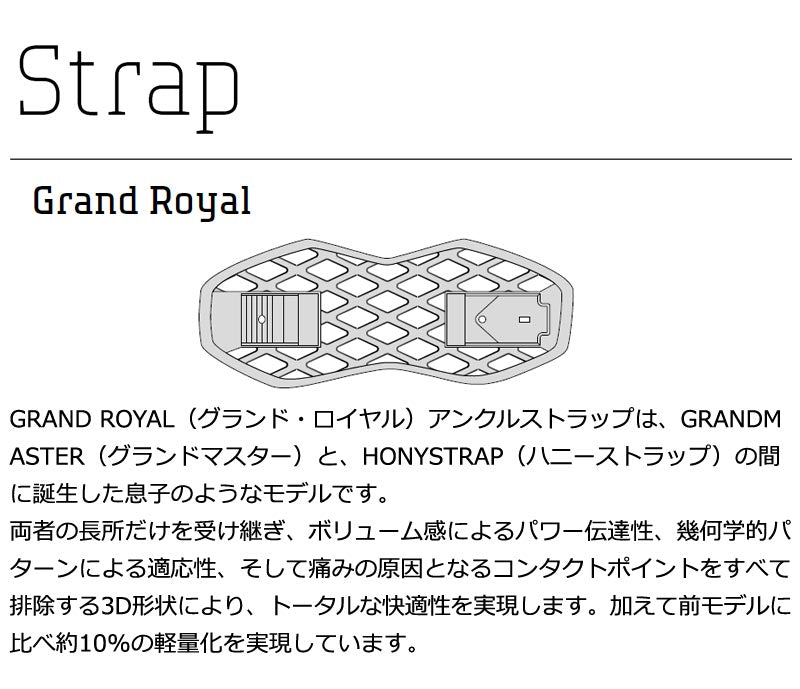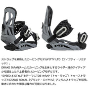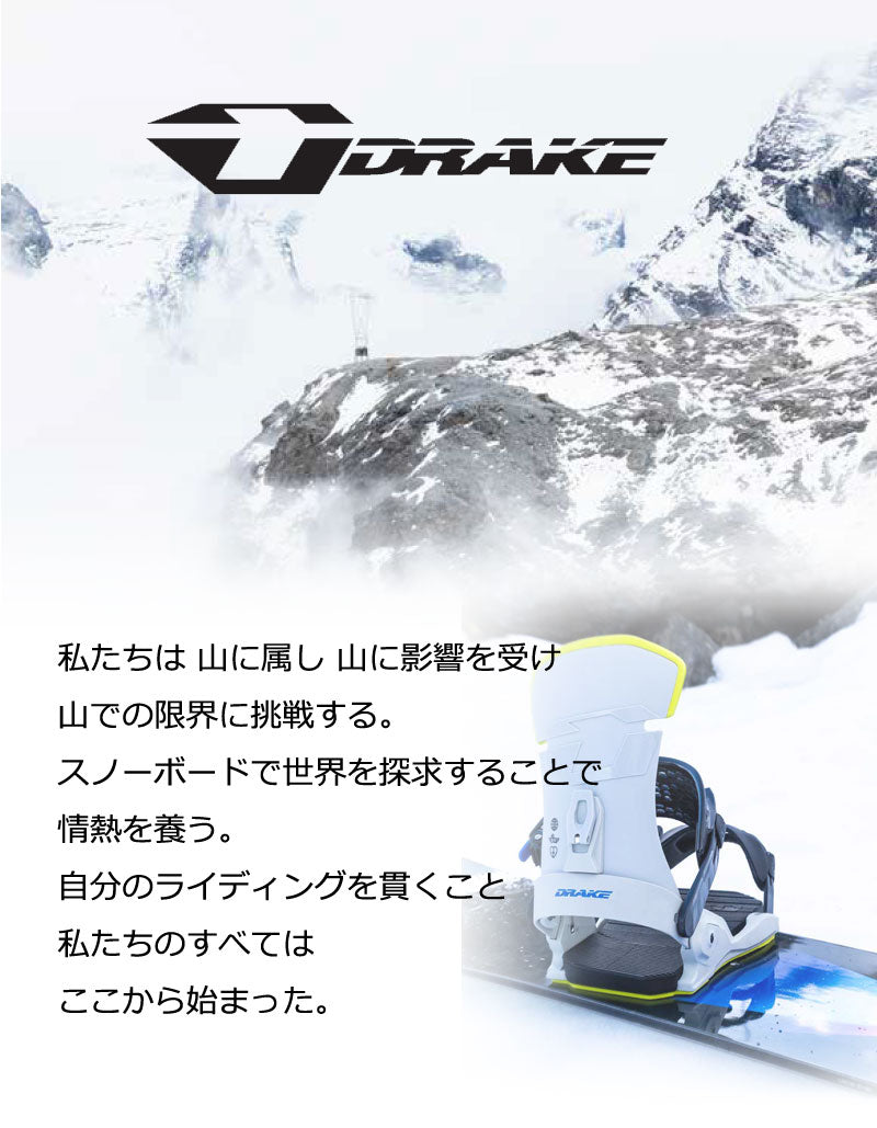 ティ・リミテッド)。 DRAKE JAPANチームのカービングを主体とするライダー達のアイディアから誕生した中上級者向けカービングモデルです。 SPEED & STYLEをテーマにTOE WRAP(トゥ−ラップ)トゥーストラップとGRAND ROYAL(グランド・ロイヤル)アンクルストラップを採用。 動きに合わせた確実な操作が可能になりました。 バインディングとブーツの相性やフィッティングに関して等、ご不明な点があればお気軽にお問い合わせください。 ※滑走での振動やストラップの着脱等でビスを使用している部分は緩んできますので、締り具合など滑走前に必ずご確認をお願いします。またご使用のブーツとストラップの調整をお願いいたします。調整が適切でない場合、負荷が集中し破損の原因となります。 |