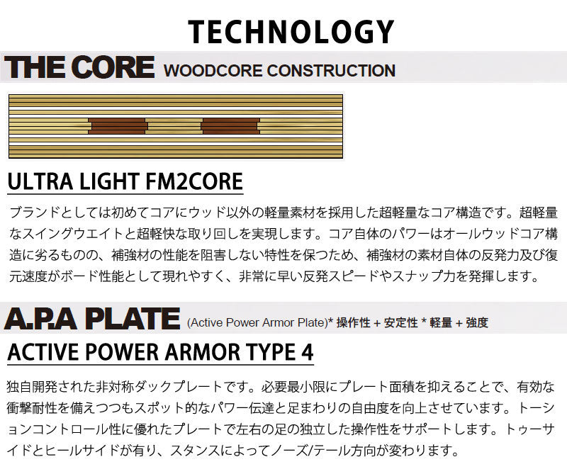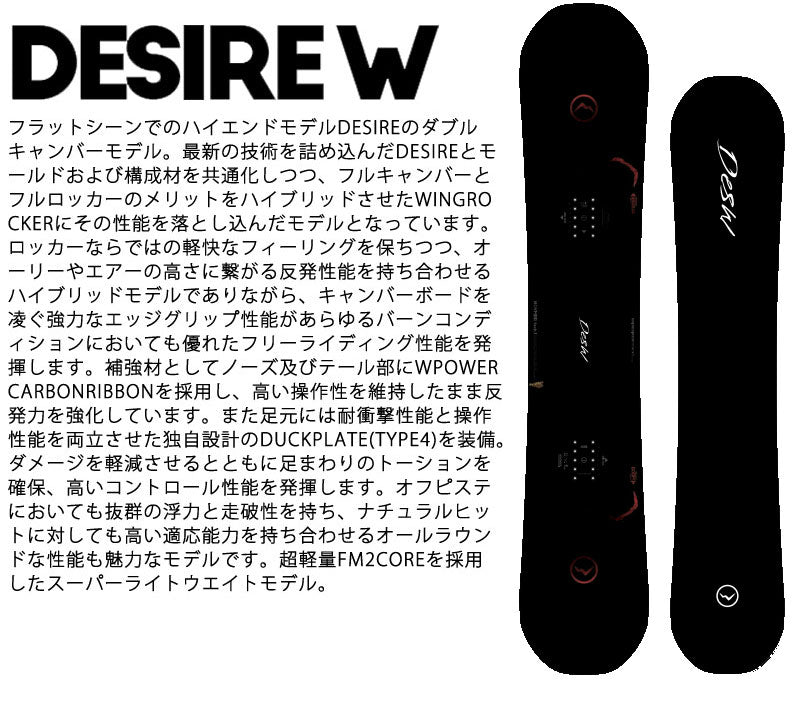 コメント フラットシーンでのハイエンドモデルDESIREのダブルキャンバーモデル。最新の技術を詰め込んだDESIREとモールドおよび構成材を共通化しつつ、フルキャンバーとフルロッカーのメリットをハイブリッドさせたWINGROCKERにその性能を落とし込んだモデルとなっています。ロッカーならではの軽快なフィーリングを保ちつつ、オーリーやエアーの高さに繋がる反発性能を持ち合わせるハイブリッドモデルでありながら、キャンバーボードを凌ぐ強力なエッジグリップ性能があらゆるバーンコンディションにおいても優れたフリーライディング性能を発揮します。補強材としてノーズ及びテール部にWPOWERCARBONRIBBONを採用し、高い操作性を維持したまま反発力を強化しています。また足元には耐衝撃性能と操作性能を両立させた独自設計のDUCKPLATE(TYPE4)を装備。ダメージを軽減させるとともに足まわりのトーションを確保、高いコントロール性能を発揮します。オフピステにおいても抜群の浮力と走破性を持ち、ナチュラルヒットに対しても高い適応能力を持ち合わせるオールラウンドな性能も魅力なモデルです。超軽量FM2COREを採用したスーパーライトウエイトモデル。