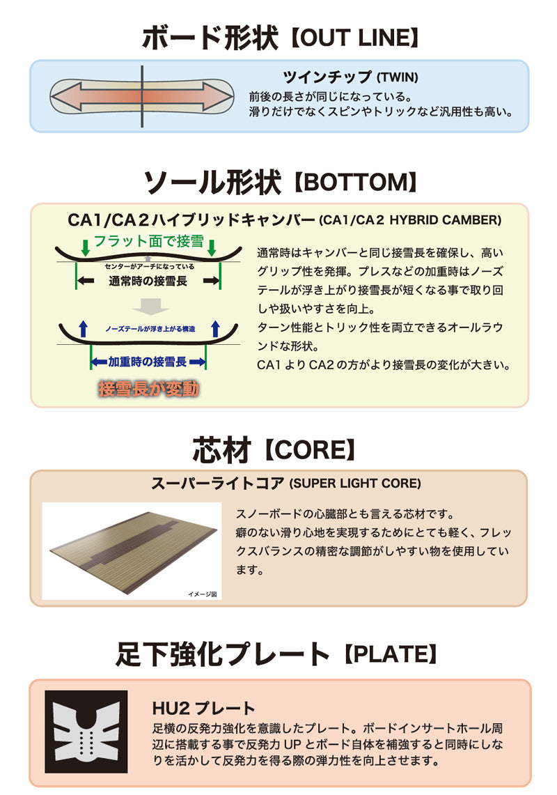 | 形状 | ハイブリッドキャンバー(CA2 CAMBER)ツインチップ |
