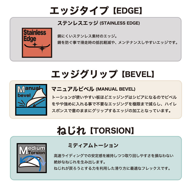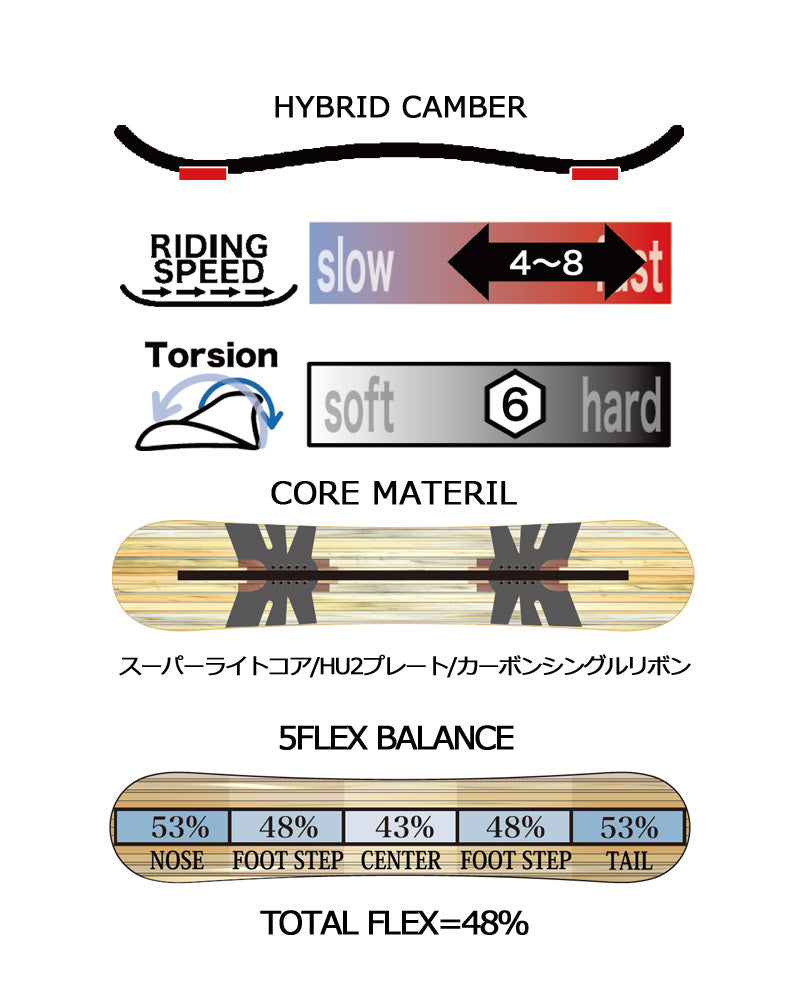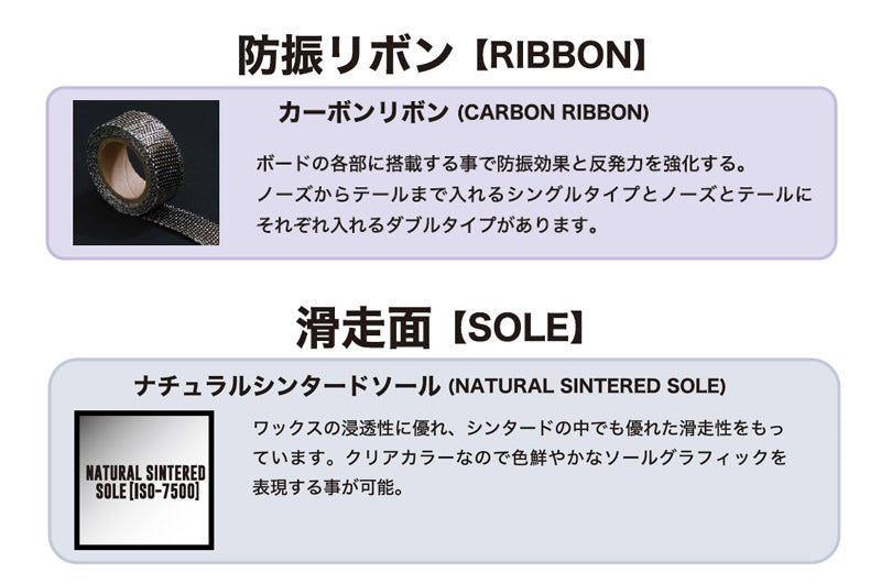| 滑走適正スタイル | 1.フリーラン 2.ワンメイク(キッカー) 3.ジブトリック(BOX&レール) 4.グラトリ(グランドトリック) (スタイルや技術によって変化します) |