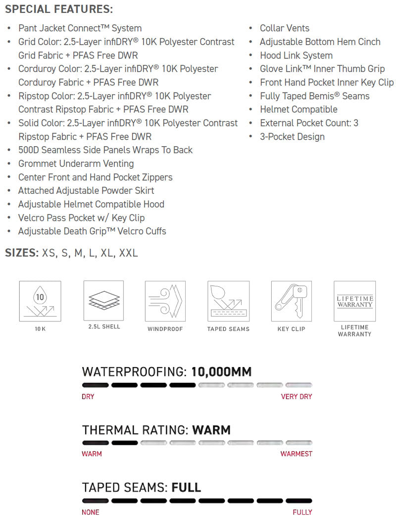2.5レイヤーのウルトラライトシェルとワイドショートのトレンドフィットアノラックです。 686の“テクニカル+ファッション”を存分に打ち出し、ムーブメントの先頭を走るようなアイテムです。 フロントの2WAYジッパーはベンチレーションとしても機能し、パッキングする際に便利なフードリンクや左袖にあるスリーブパスポケット、雪の侵入を防ぐ為にパンツと連結して使用するパウダースカート+PJコネクトシステムなど機能面も充実です。 ※こちらはジャケットのみの販売となり、上下セット販売ではございませんのでご注意ください。 ※掲載写真の色合いは、PCモニター環境や撮影時の光環境により実物と若干違う可能性もございますのでご了承ください。 サイズ感や生地感などご不明点ございましたらお気軽にお問い合わせください。 |