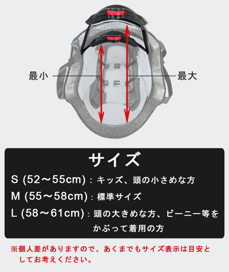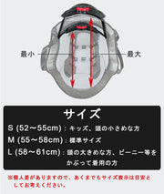 ・S 52cm~55cm (キッズや頭の小さめな方向け) ・M 55cm~58cm (標準サイズ) ・L 58cm~61cm (頭の大きめな方やビーニー等をかぶって着用の方向け) ※個人差がありますので、あくまでもサイズ表示は目安としてお考えください。 |