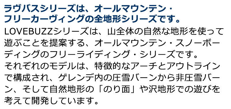 ラヴバスシリーズは、オールマウンテン・フリーカーヴィングの全地形シリーズです。 LOVEBUZZシリーズは、山全体の自然な地形を使って遊ぶことを提案する、オールマウンテン・スノーボーディングのフリーライディング・シリーズです。それぞれのモデルは、特徴的なアーチとアウトラインで構成され、ゲレンデ内の圧雪バーンから非圧雪バーン、そして自然地形の「のり面」や沢地形での遊びを考えて開発しています。 148はLOVEBUZZのウィメンズモデル。低めのキャンバー、大きなRの長いノーズ、ムーンテールというシェイプで、オンピステでのフリーランからパウダーまで広い適応能力を持ったフリーランモデルです。 152はメンズのショートモデル。低めのキャンバー、大きなRの長いノーズ、ムーンテールというシェイプで、オンピステでのフリーランからパウダーまで広い適応能力を持ったフリーランモデルです。 158はメンズのスタンダードレングス。低めのキャンバー、大きなRの長いノーズ、ムーンテールというシェイプで、オンピステでのフリーランからパウダーまで広い適応能力を持ったフリーランモデルです。 162は長めのメンズモデル。低めのキャンバー、大きなRの長いノーズ、ムーンテールというシェイプで、オンピステでのフリーランからパウダーまで広い適応能力を持ったフリーランモデルです。 しっかりとしたメンテナンス施行を行わせて頂いておりますので、メンテナンス無しをお選びいただいた場合より当店加工のBASIC & EXPERTベースメンテナンスもご希望の際は、通常発送より2~4日後の発送となります。 多少お時間頂きます事をご了承ください。 |