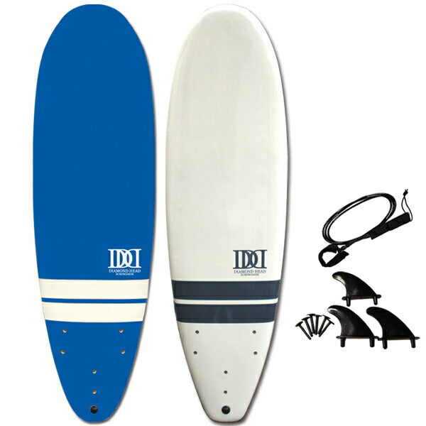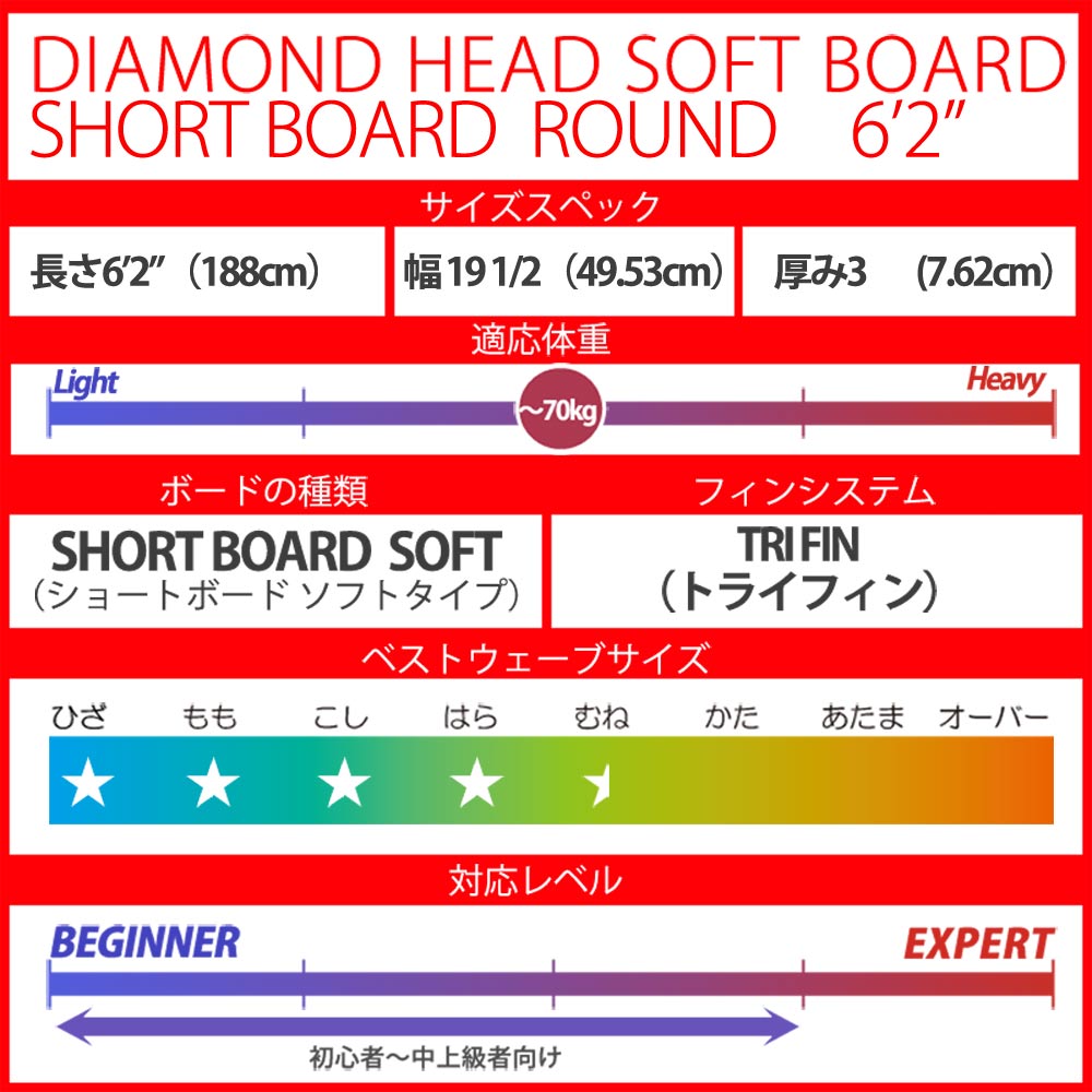 サーフボード ソフトボード 6'2 ショートボード ラウンドノーズ ミニロング ダイアモンドヘッド ホワイト フィン・リーシュコード付 営業所止め