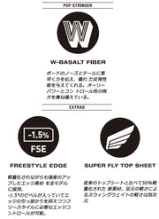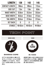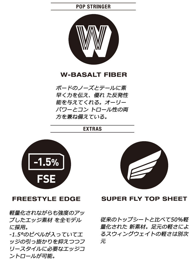 | 滑走適正スタイル | 1.ワンメイク(キッカー) 2.カービング 3.ジブトリック(BOX&レール) 4.グラトリ(グランドトリック) (スタイルや技術によって変化します) |