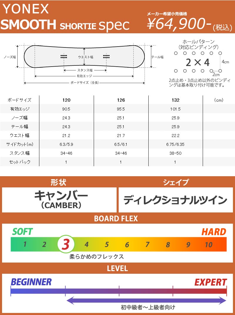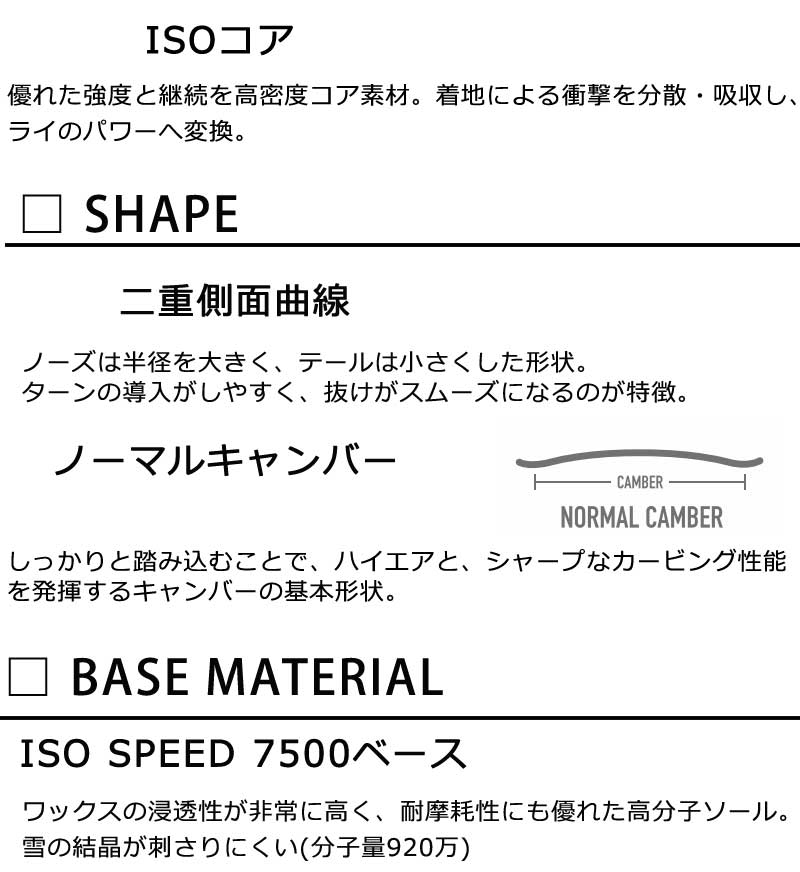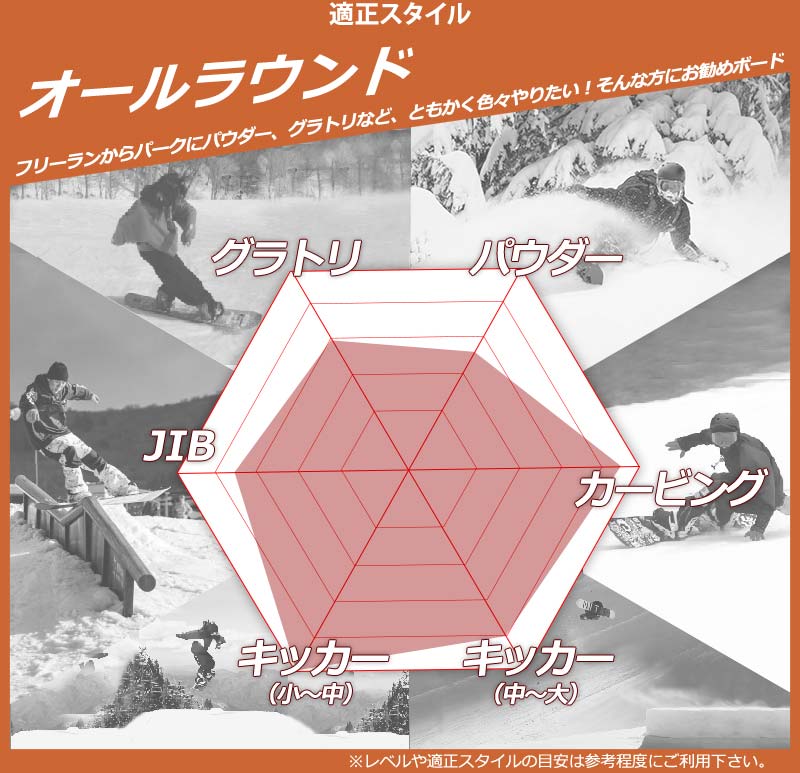 | 滑走適正スタイル | 1.カービング 2.フリーラン 3.ワンメイク(キッカー) 4.ハーフパイプ (スタイルや技術によって変化します) |