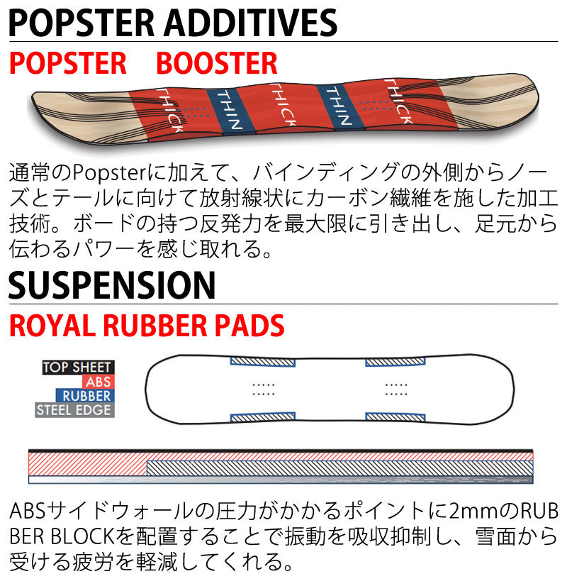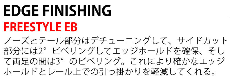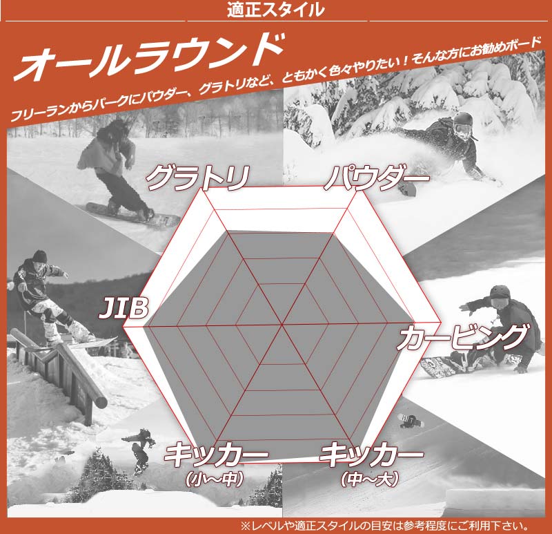 | 滑走適正スタイル | 1.ワンメイク(キッカー) 2.ジブトリック(BOX&レール) 3.フリーラン 4.ハーフパイプ (スタイルや技術によって変化します) |