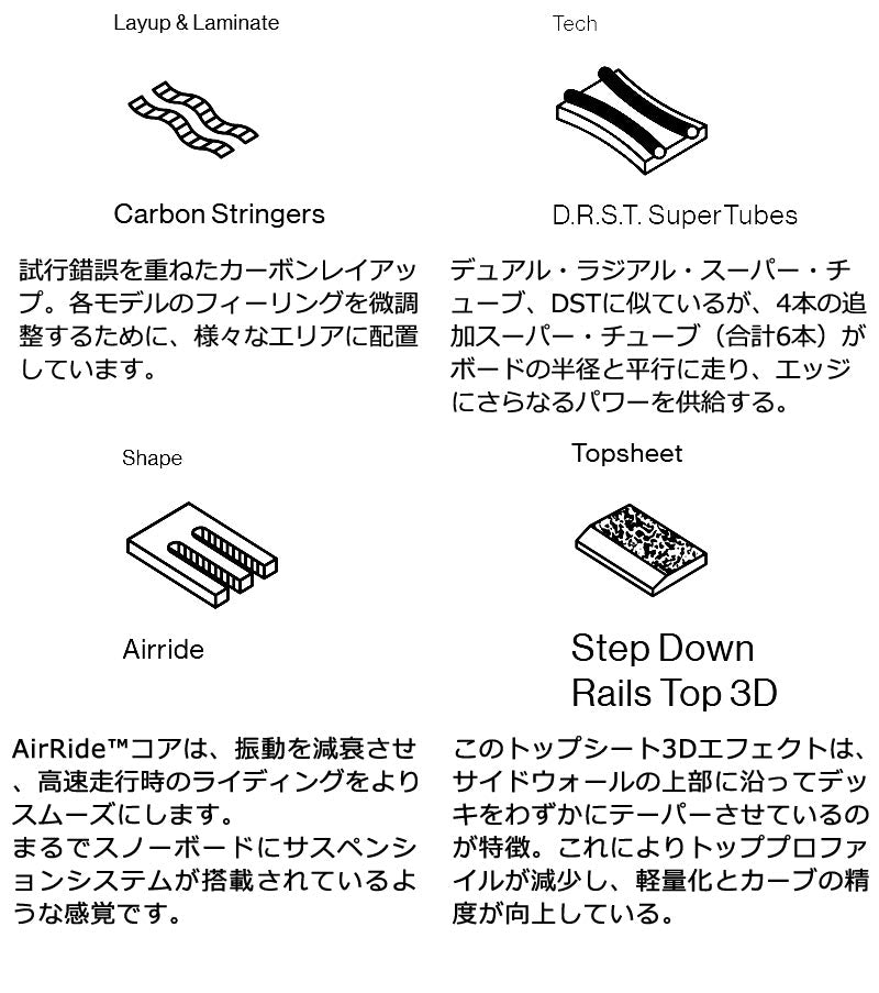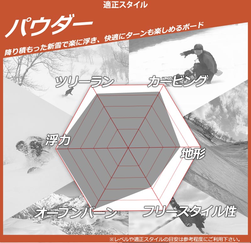 | 滑走適正スタイル | 1.パウダーラン 2.フリーラン 3.カービング (スタイルや技術によって変化します) |