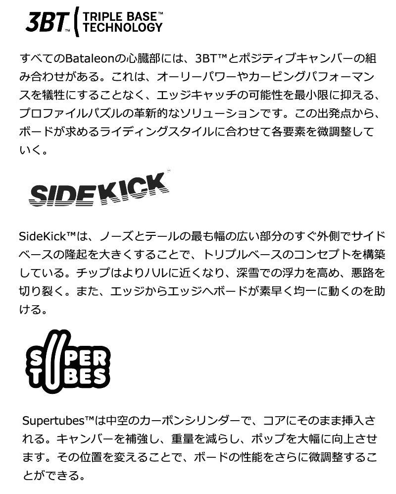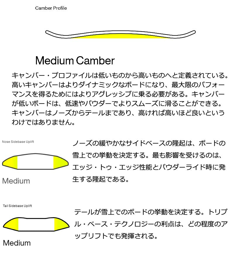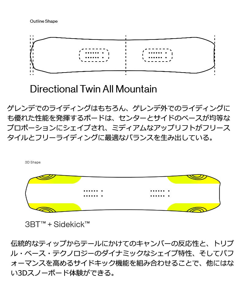 | 形状 | キャンバー(MEDIUM CAMBER 3BT+SIDEKICK)ディレクショナルツイン |