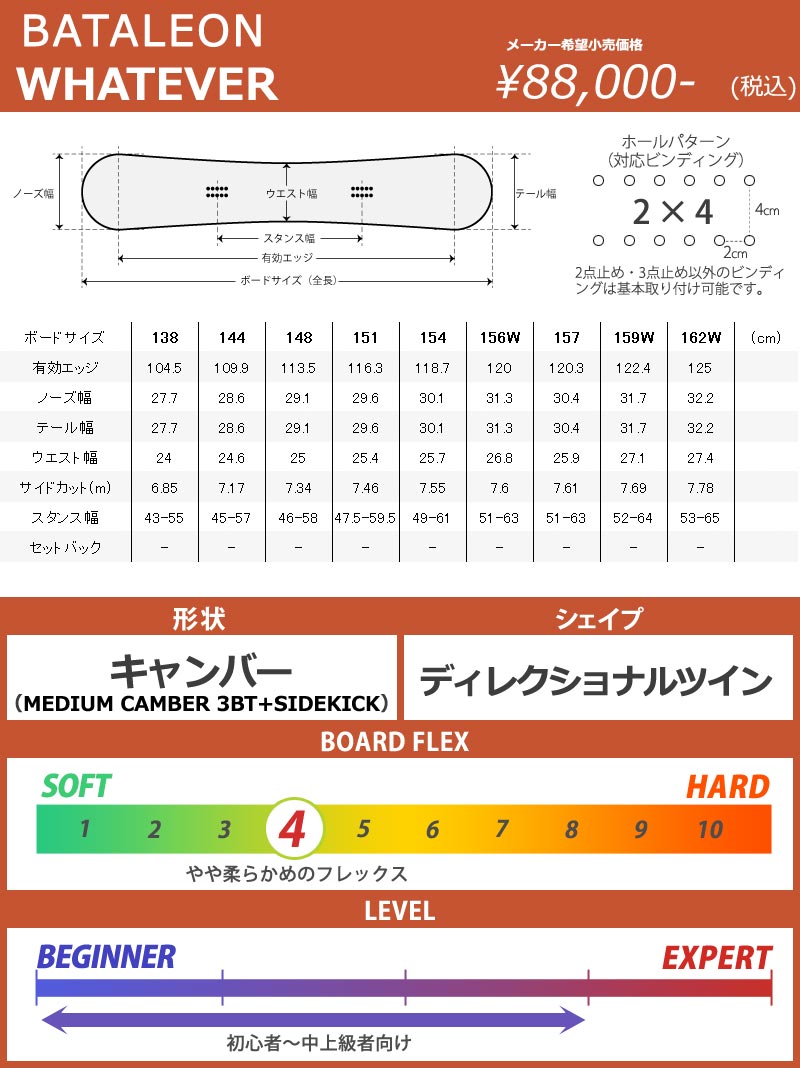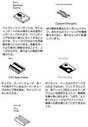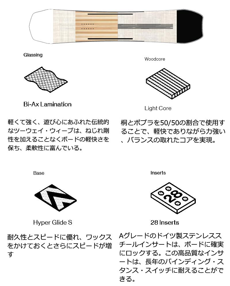 | 滑走適正スタイル | 1.フリーラン 2.カービング 3.パウダーラン 4.ワンメイク(キッカー) (スタイルや技術によって変化します) |
