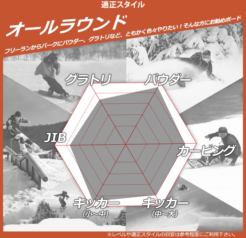 | 適正スタイル | 1.フリーラン2.カービング3.パウダーラン4.ワンメイク(キッカー) | ||