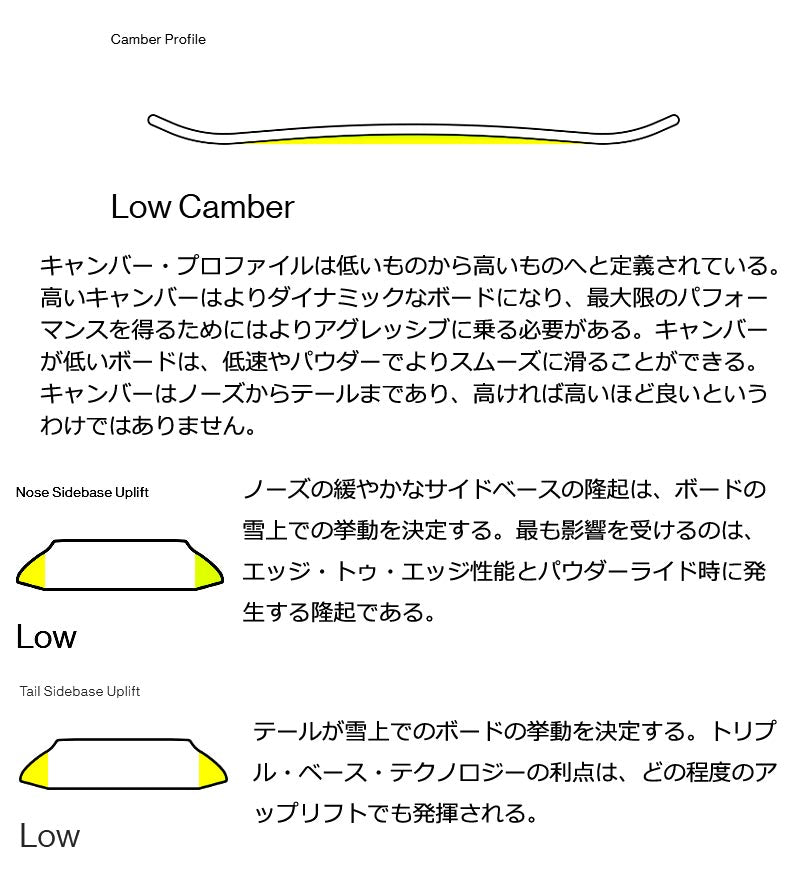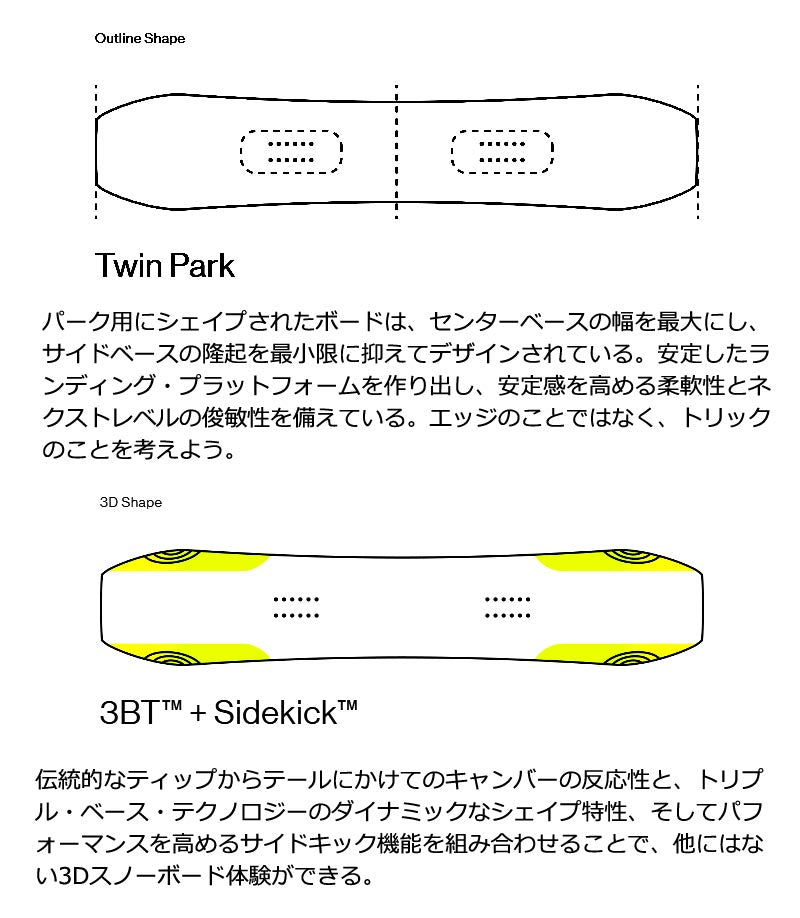 | 形状 | キャンバー(LOW CAMBER 3BT+SIDEKICK)ツインチップ |