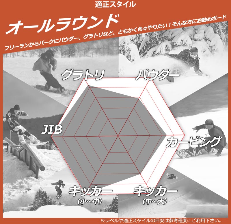 | 適正スタイル | 1.ジブトリック(BOX&レール)2.ワンメイク(キッカー)3.グラトリ(グランドトリック)4.フリーラン | ||