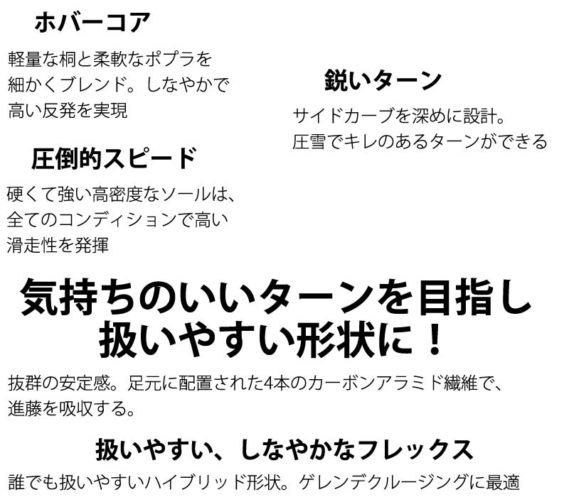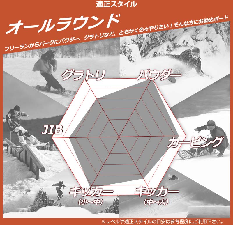 | 滑走適正スタイル | 1.フリーラン 2.パウダーラン 3.カービング 4.ワンメイク(キッカー) (スタイルや技術によって変化します) |