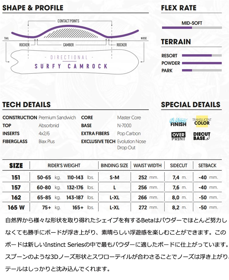 コメント 自然界から様々な形状を取り得れたシェイプを有するBetaはパウダーでほとんど努力しなくても勝手にボードが浮き上がり、素晴らしい浮遊感を楽しむことができます。このボードは新しいInstinct Seriesの中で最もパウダーに適したボードに仕上がっています。スプーンのような3Dノーズ形状とスワローテイルが合わさることでノーズは浮き上がり、テールはしっかりと沈み込んでくれます。 全体のディレクショナルシェイプはパウダーシーンの土曜な地形であっても水が流れるようなスムーズライディングを提供します。Betaのウッドコアにはサステイナブルなスイスポプラ—を採用し、高いポップを生み出すようにカーボン補強を取り入れています。トップシートにはAbsorbnidを採用することでバタつきを軽減してくれます。