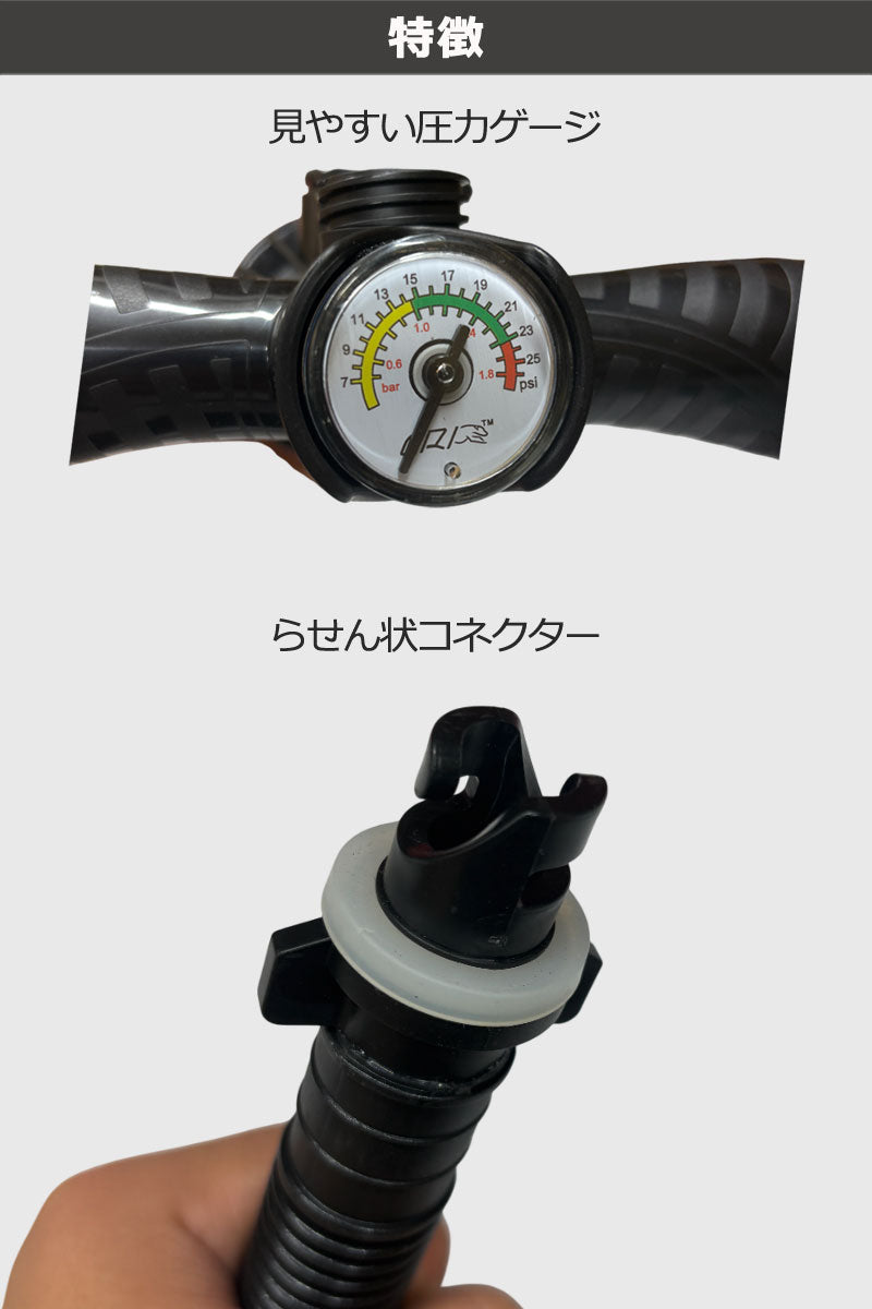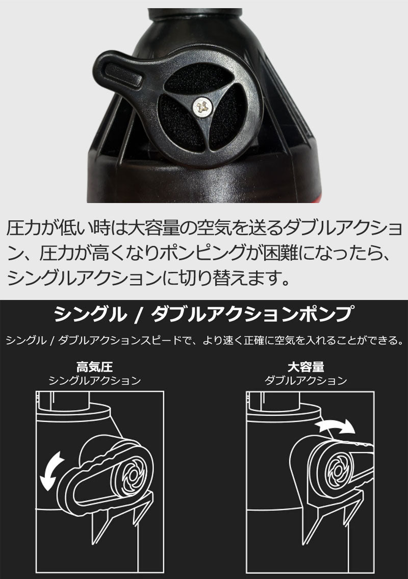 | コメント | 圧力が低い時は大容量の空気を送るダブルアクション、圧力が高くなりポンピングが困難になったら、シングルアクションに切り替えます。 ※ホースの色が商品画像と異なる場合がございます。予めご了承ください。 |