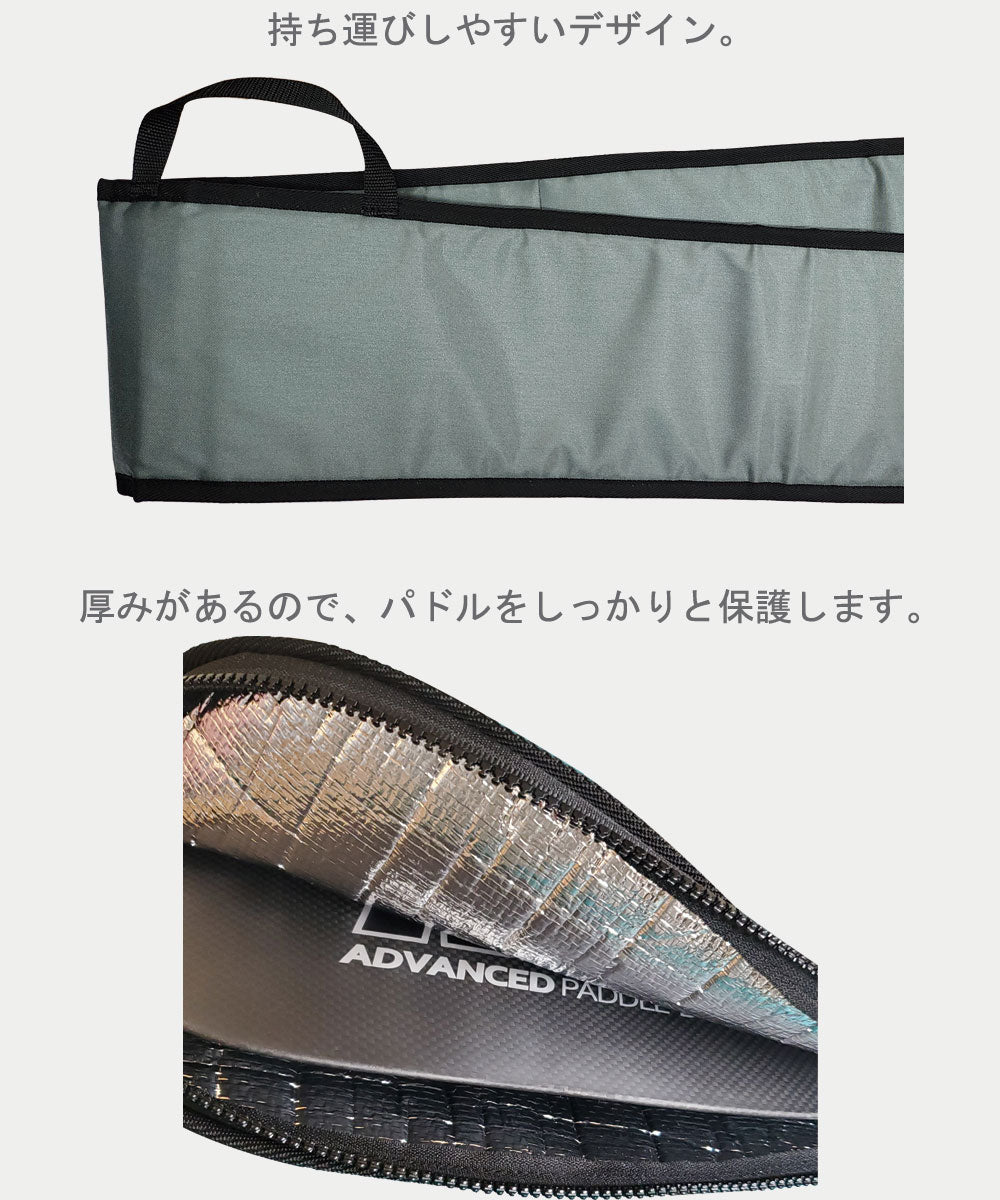 | 説明 | 最大約190cm (75inch) まで収納可能。 濡れた手でも開閉しやすいよう、大きめのジッパーを取り付けました。 中央に持ち手がついているので、持ち運びしやすいデザイン。 生地には厚みがあるので、パドルをしっかりと保護します。 ※撮影状況やディスプレイ環境設定状況により、商品の色味が実物とは異なって見える場合がございます。 |