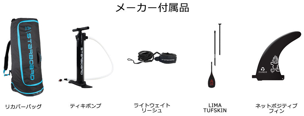 ・3P パドル ・ダブルアクションティキポンプ ・キャスター付きバッグ ・フィン(8″) ・リペアキット(リペアボンド無し) ・軽量リーシュ |