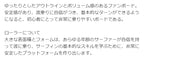 | コメント | ハンドシェイプファンボードは余裕のあるアウトラインと十分なボリュームによる安定性により、初心者がとても簡単にそして安心に波に乗り、基礎的なターンをし始めることができるボードです。 Softechはソフトボードの分野において究極のファンとパフォーマンスを提供します。 非常に優れた耐久性を持つ素材を使用し、十分な実績のある工業技術を利用して作られたSoftechの ポードは、考えうる限り最もタフな使用にも耐え、ビギナーから経験豊かなサーファーまでさま ざまなスタイルに対応します。 Softechのソフトボードは、ソフトボードのパフォーマンス性と テクノロジーという面においてリーダー的な存在にあります。 どんな年代のサーファーにも、 またどんなレベルのサーファーにも適応するように、さまざまなサイズとデザインを取り揃えています。 親子で同じボードで楽しめるおススメサーフボードです。 ※FCS2タイプのモデルにはFCSのスクリュー(ネジ)は付属しておりません。 |