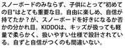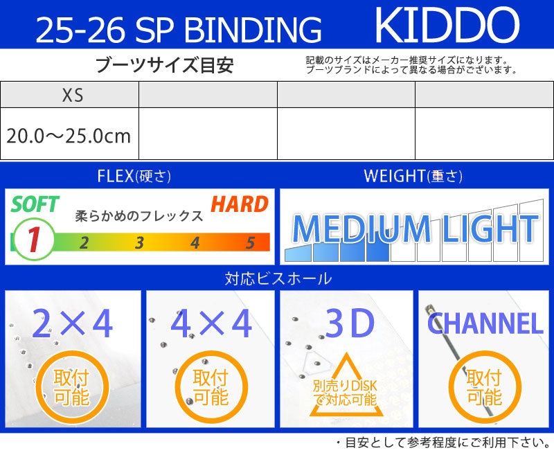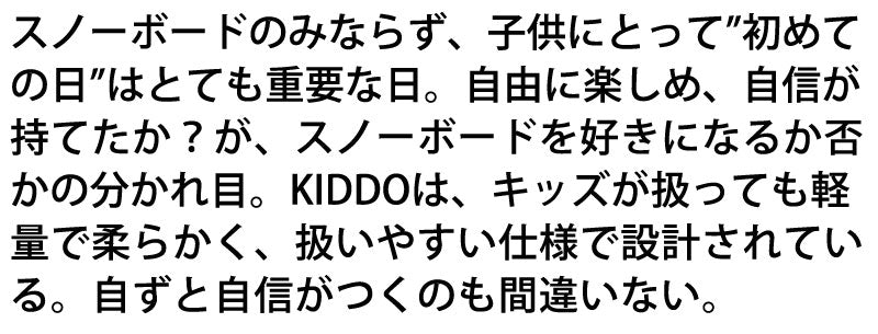 スノーボードのみならず、子供にとって”初めての日”はとても重要な日。自由に楽しめ、自信が持てたか?が、スノーボードを好きになるか否かの分かれ目。KIDDOは、キッズが扱っても軽量で柔らかく、扱いやすい仕様で設計されている。自ずと自信がつくのも間違いない。 バインディングとブーツの相性やフィッティングに関して等、ご不明な点があればお気軽にお問い合わせください。 ※滑走での振動やストラップの着脱等でビスを使用している部分は緩んできますので、締り具合など滑走前に必ずご確認をお願いします。またご使用のブーツとストラップの調整をお願いいたします。調整が適切でない場合、負荷が集中し破損の原因となります。 |