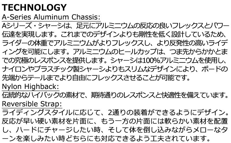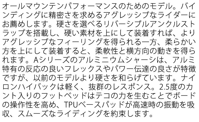オールマウンテンパフォーマンスの為のモデル。バインディングに精密さを求めるアグレッシブなライダーにお勧めします。硬さを選べるリバーシブルアンクルストラップを搭載し、硬い素材を上にして装着すれば、よりアグレッシブなフィーリングを得られる一方、柔らかい方を上にして装着すると、柔軟性と横方向の動きを得られます。Aシリーズのアルミシャーシは、アルミニウム特有の反応の良いフレックスやパワー伝達の良さが特徴ですが、以前のモデルより硬さを和らげてます。 バインディングとブーツの相性やフィッティングに関して等、ご不明な点があればお気軽にお問い合わせください。 ※滑走での振動やストラップの着脱等でビスを使用している部分は緩んできますので、締り具合など滑走前に必ずご確認をお願いします。またご使用のブーツとストラップの調整をお願いいたします。調整が適切でない場合、負荷が集中し破損の原因となります。 |