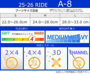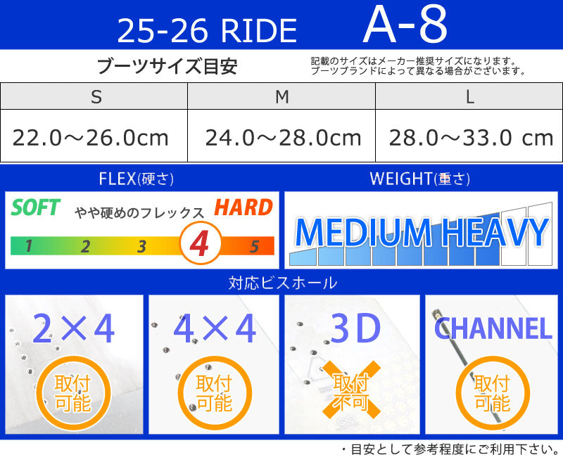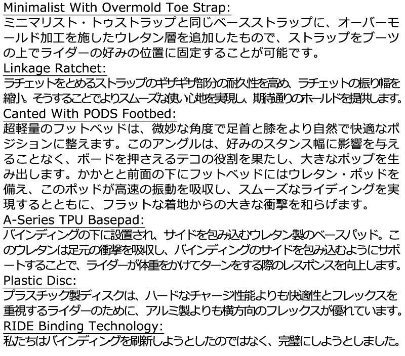 | ベストマッチブーツ | ・RIDE/ライド ※ご使用サイズやモデル等で変わる部分もございますのであくまで目安としてお考え下さい。 こちらに記載以外のバインディングにも使用可能です。 |