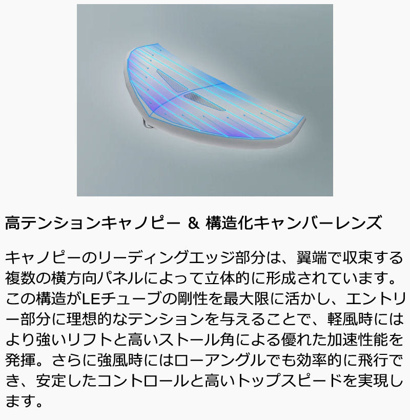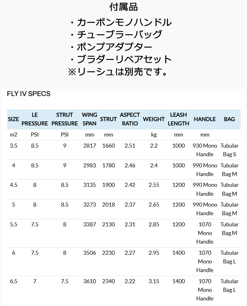 5.0平米 重量:2.65kg 【空気圧】 LE:8PSI ストラット:8.5PSI スパン:3273mm ストラット:2018mm アスペクト比:2.37 推奨リーシュの長さ:120cm 【付属品】 ・990カーボンモノハンドル ・チューブラーバッグ (M) ・ポンプアダプター ・ブラダーリペアセット ※リーシュコード、ポンプは付属しておりません。 ※予告なくデザイン、内容が変更される場合がございます。