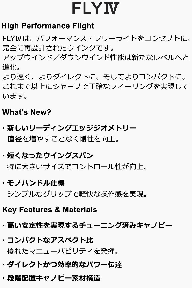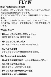 FLY4は、パフォーマンス・フリーライドをコンセプトに、完全に再設計されたウイングです。 アップウインド・ダウンウインド性能は新たなレベルへと進化。より速く、よりダイレクトに、そしてよりコンパクトに。これまで以上にシャープで正確なフィーリングを実現しています。