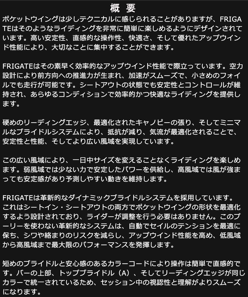 FRIGATEは水上での自由と滞在時間を最大化するためのウイングだ。ビギナーから冒険志向の上級者まで、すべてのライダーのダウンウインドを、より快適で自由なものにするだろう。 |