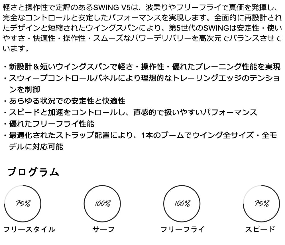 | 特徴 | 軽さと操作性で定評のあるSWING V5は、波乗りやフリーフライで真価を発揮し、完全なコントロールと安定したパフォーマンスを実現します。全面的に再設計されたデザインと短縮されたウイングスパンにより、第5世代のSWINGは安定性・使いやすさ・快適性・操作性・スムーズなパワーデリバリーを高次元でバランスさせています。 |