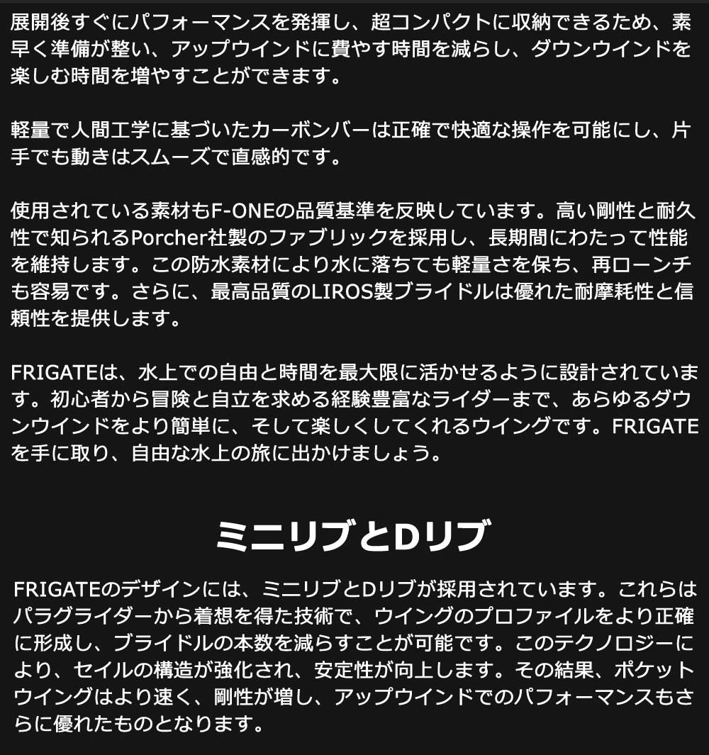 FRIGATEは水上での自由と滞在時間を最大化するためのウイングだ。ビギナーから冒険志向の上級者まで、すべてのライダーのダウンウインドを、より快適で自由なものにするだろう。