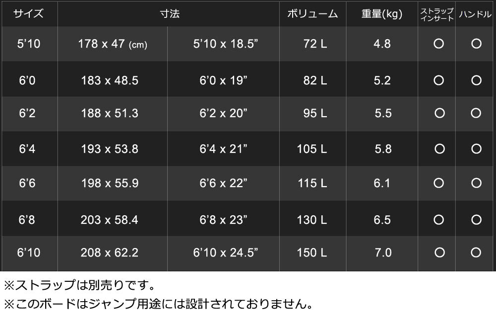 | スペック | 6'0 (183) ×19 (48.5cm) 82L / 約5.2kg ※重量は個体差があります。 ストラップインサート:あり (別売り) ハンドル:あり |