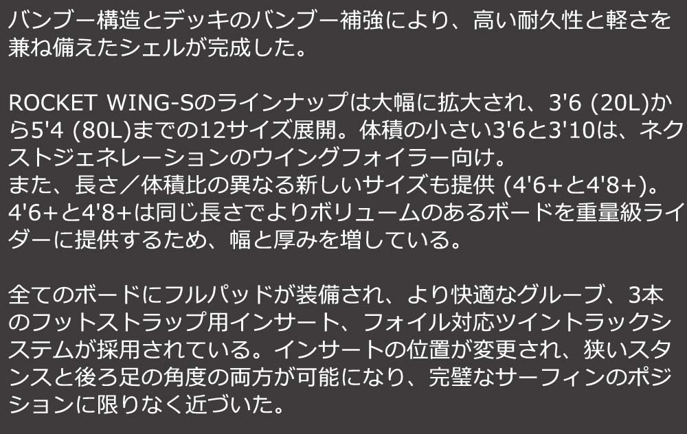 ROCKET WING-Sのラインナップは大幅に拡大され、3'6 (20L)から5'4 (80L)までの12サイズ展開。